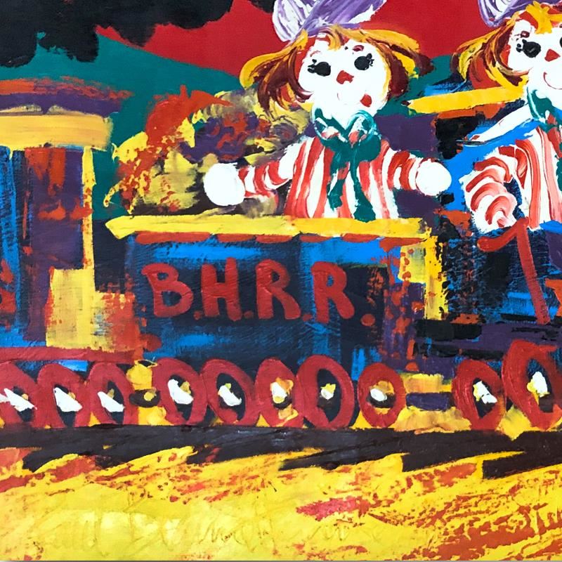 "Choo-Choo Children" is an original oil painting on stretched canvas by Paul Blaine Henrie (1932-1999). The piece is hand signed by the artist and comes with a letter of authenticity. Please note that due to the age of this piece and the way it was stored, there are minor sings of wear, particularly on the corners and edges. Measures approximately. 40" x 72" (image).