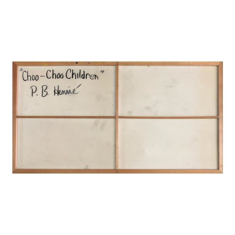 "Choo-Choo Children" is an original oil painting on stretched canvas by Paul Blaine Henrie (1932-1999). The piece is hand signed by the artist and comes with a letter of authenticity. Please note that due to the age of this piece and the way it was stored, there are minor sings of wear, particularly on the corners and edges. Measures approximately. 40" x 72" (image).