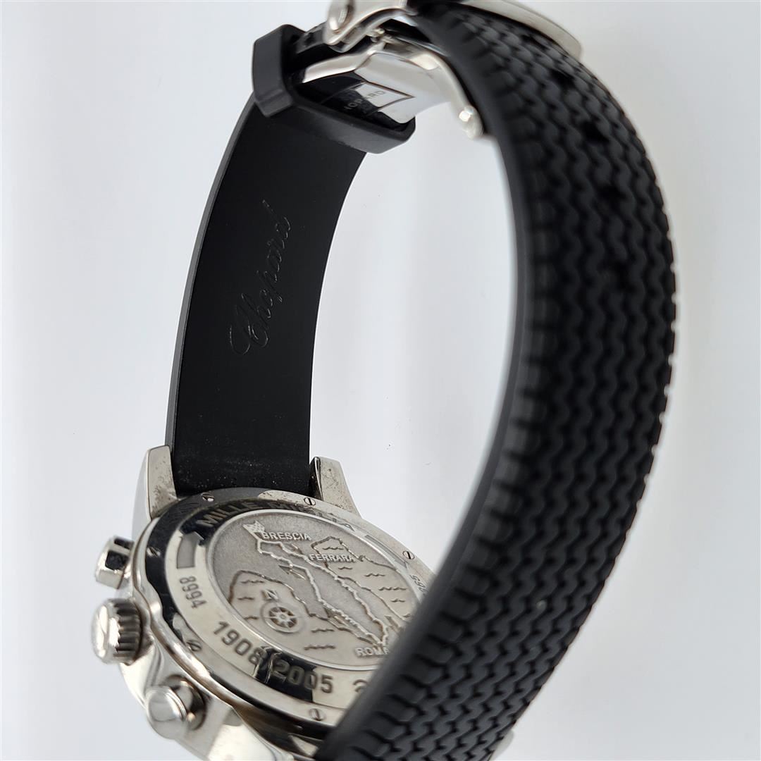 One Chopard 1000 Miglia GMT Chonometer Wristwatch. Stainless steel case with a stainless steel bracelet. Fixed stainless steel bezel with 24 hour markings. Black dial with luminous hands and index hour markers. Minute markers. Tachymeter around the outer rim. Dial Type: Analog. Luminescent hands and markers. Date displays at the 3 o'clock position. Chronograph - three sub-dials displaying: 60 second, 30 minute and 12 hour (dual time zone). Automatic movement. Scratch resistant sapphire crystal. Pull / push crown. Skeleton case back. Case diameter: 42.5 mm. Case thickness: 14.8 mm. Round case shape. Band width: 20 mm. Water resistant at 50 meters / 165 feet. Functions: hours/ minutes/ seconds/ date/ chronograph. Additional Info: powers automatically with the movement of your arm. Sport watch style. Watch label: Swiss Made. Chopard Mille Miglia GMT Steel Men's Watch 15/8992.