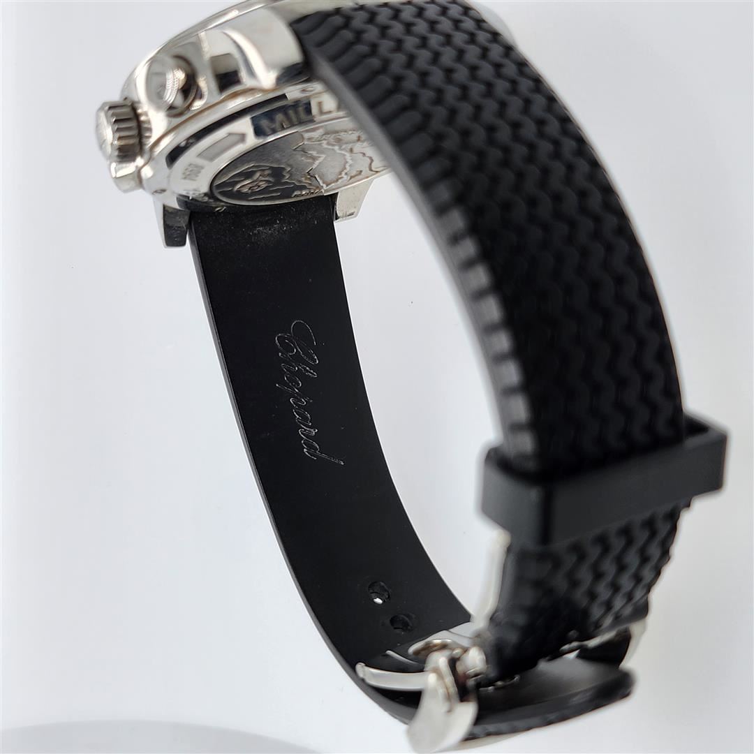 One Chopard 1000 Miglia GMT Chonometer Wristwatch. Stainless steel case with a stainless steel bracelet. Fixed stainless steel bezel with 24 hour markings. Black dial with luminous hands and index hour markers. Minute markers. Tachymeter around the outer rim. Dial Type: Analog. Luminescent hands and markers. Date displays at the 3 o'clock position. Chronograph - three sub-dials displaying: 60 second, 30 minute and 12 hour (dual time zone). Automatic movement. Scratch resistant sapphire crystal. Pull / push crown. Skeleton case back. Case diameter: 42.5 mm. Case thickness: 14.8 mm. Round case shape. Band width: 20 mm. Water resistant at 50 meters / 165 feet. Functions: hours/ minutes/ seconds/ date/ chronograph. Additional Info: powers automatically with the movement of your arm. Sport watch style. Watch label: Swiss Made. Chopard Mille Miglia GMT Steel Men's Watch 15/8992.