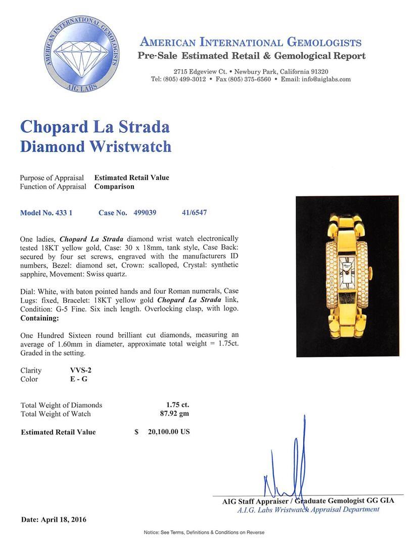 One ladies, Chopard La Strada diamond wrist watch electronically tested 18KT yellow gold, Case: 30 x 18mm, tank style, Case Back: secured by four set screws, engraved with the manufacturers ID numbers, Bezel: diamond set, Crown: scalloped, Crystal: synthetic sapphire, Movement: Swiss quartz. Dial: White, with baton pointed hands and four Roman numerals, Case Lugs: fixed, Bracelet: 18KT yellow gold Chopard La Strada link, Condition: G-5 Fine. Six inch length. Overlocking clasp, with logo. Containing: One Hundred Sixteen round brilliant cut diamonds, measuring an average of 1.60mm in diameter, approximate total weight = 1.75ct. Graded in the setting. Clarity: VVS-2. Color: E - G. Total Weight of Diamonds 1.75ct. Total Weight of Watch 87.92gm. AIG Appraised at $20,100.00.