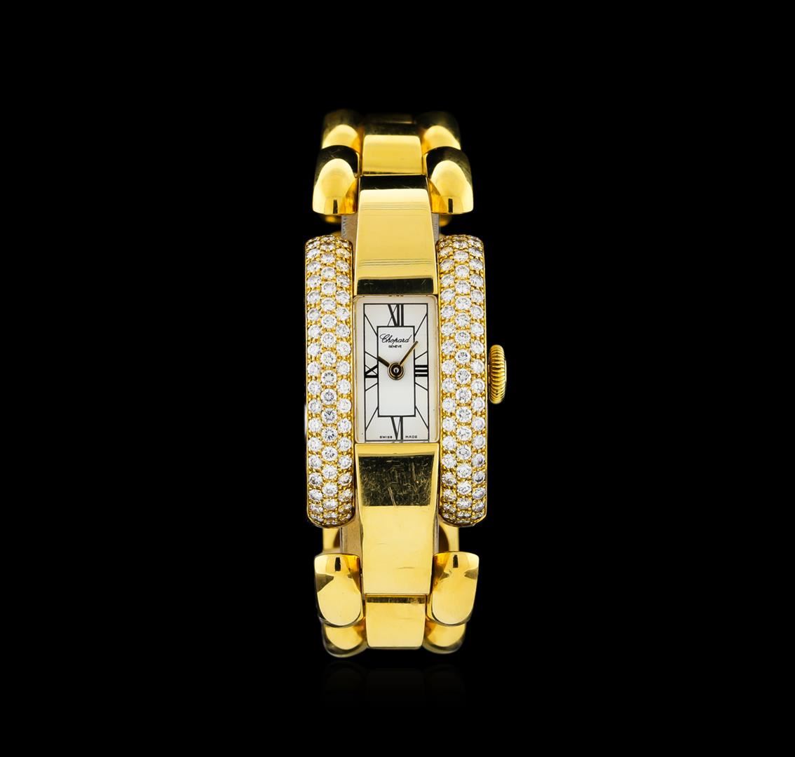 One ladies, Chopard La Strada diamond wrist watch electronically tested 18KT yellow gold, Case: 30 x 18mm, tank style, Case Back: secured by four set screws, engraved with the manufacturers ID numbers, Bezel: diamond set, Crown: scalloped, Crystal: synthetic sapphire, Movement: Swiss quartz. Dial: White, with baton pointed hands and four Roman numerals, Case Lugs: fixed, Bracelet: 18KT yellow gold Chopard La Strada link, Condition: G-5 Fine. Six inch length. Overlocking clasp, with logo. Containing: One Hundred Sixteen round brilliant cut diamonds, measuring an average of 1.60mm in diameter, approximate total weight = 1.75ct. Graded in the setting. Clarity: VVS-2. Color: E - G. Total Weight of Diamonds 1.75ct. Total Weight of Watch 87.92gm. AIG Appraised at $20,100.00.
