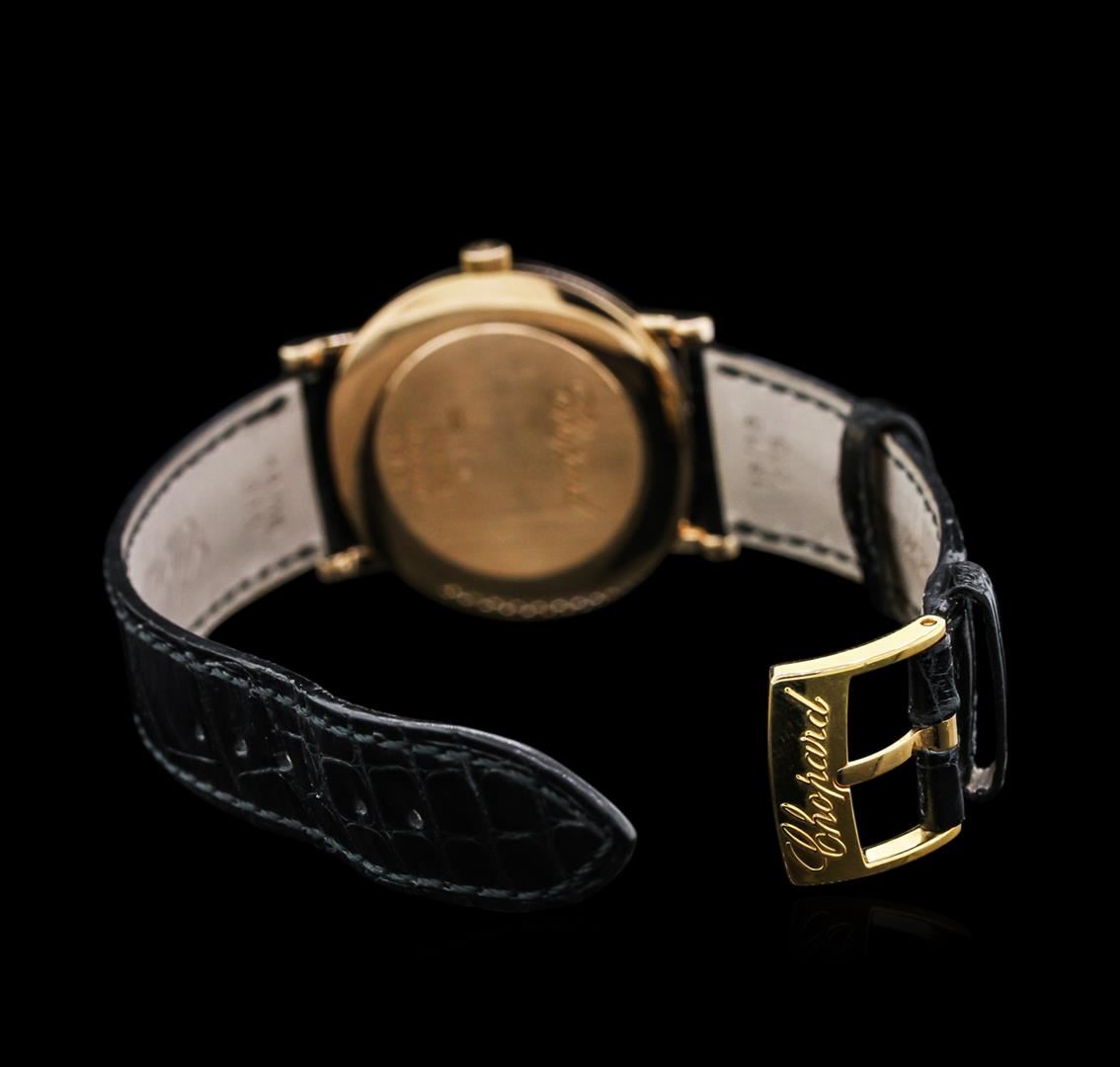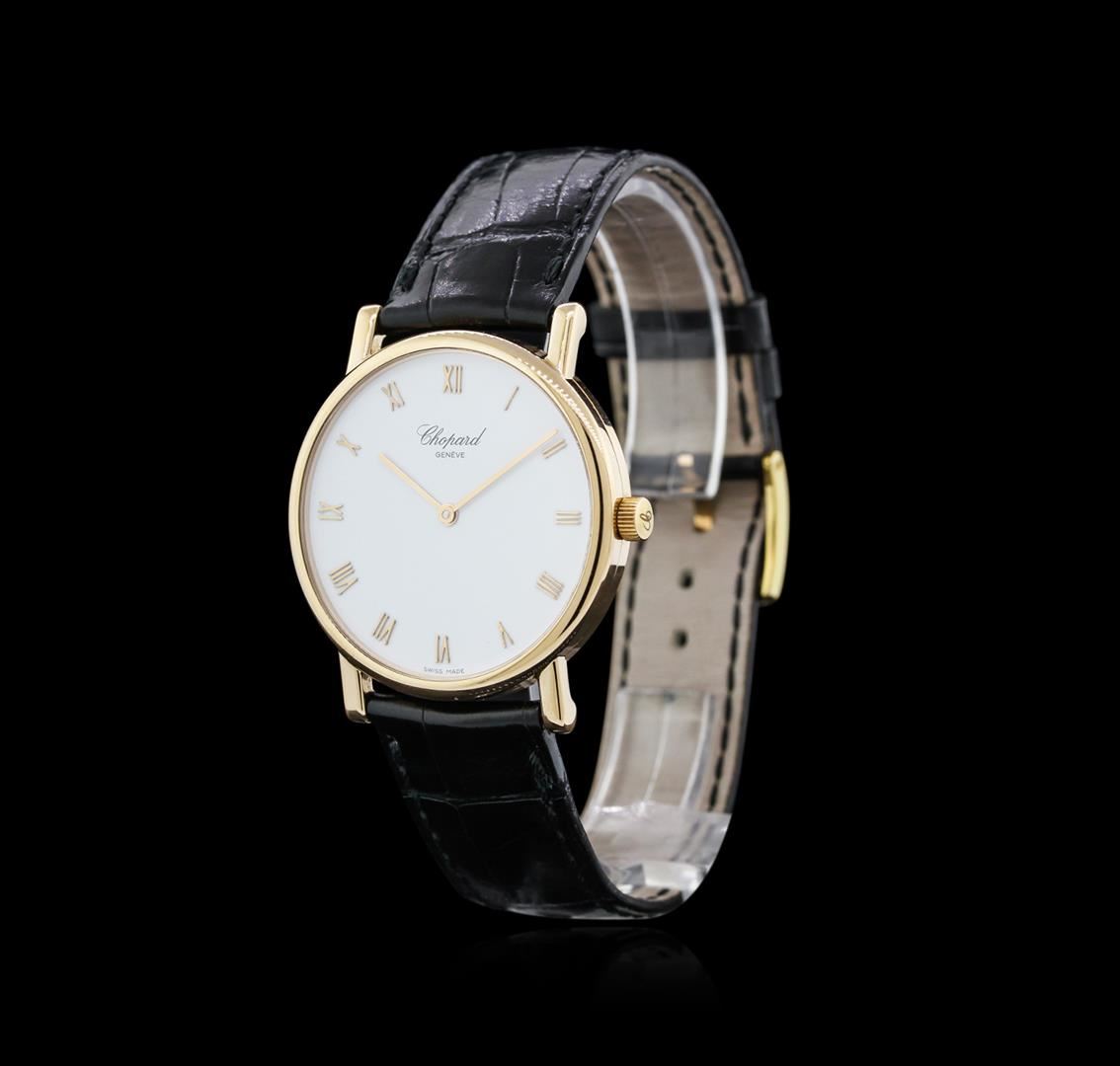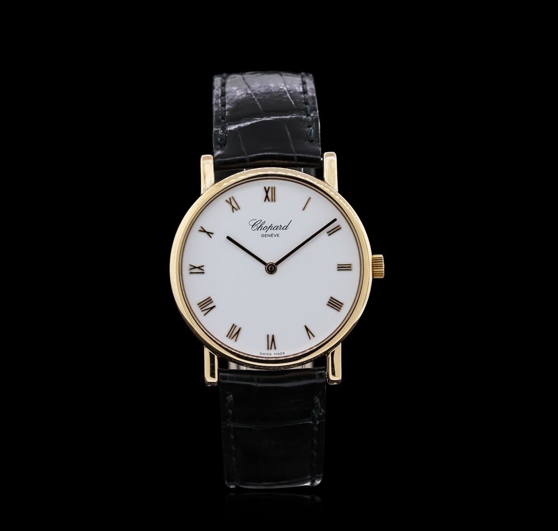 One Chopard 18KT Rose Gold Classic Homme Mens Watch. Case: 18KT rose gold. Dial: White color with Roman numerals. Bracelet and clasp: Black alligator/crocodile leather with standard buckle clasp.