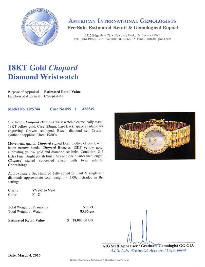 One ladies, Chopard Diamond wrist watch electronically tested 18KT yellow gold, Case: 23mm, Case Back: space available for engraving, Crown: scalloped, Bezel: diamond set, Crystal: synthetic sapphire, Circa: 1980's.Movement: quartz, Chopard signed Dial: mother of pearl, with baton narrow hands, Chopard Bracelet: 18KT yellow gold, alternating yellow gold and diamond set links, Condition: G-6 Extra Fine. Bright polish finish. Six and one quarter inch length. Chopard signed concealed clasp, with twin safeties. Containing: Approximately Six Hundred Fifty round brilliant & single cut diamonds approximate total weight = 5.00ct. Graded in the settings. Clarity: VVS-2 to VS-2. Color: F - G. Total Weight of Diamonds 5.00ct. Total Weight of Watch 83.06gm. AIG Appraised at $28,000.00.