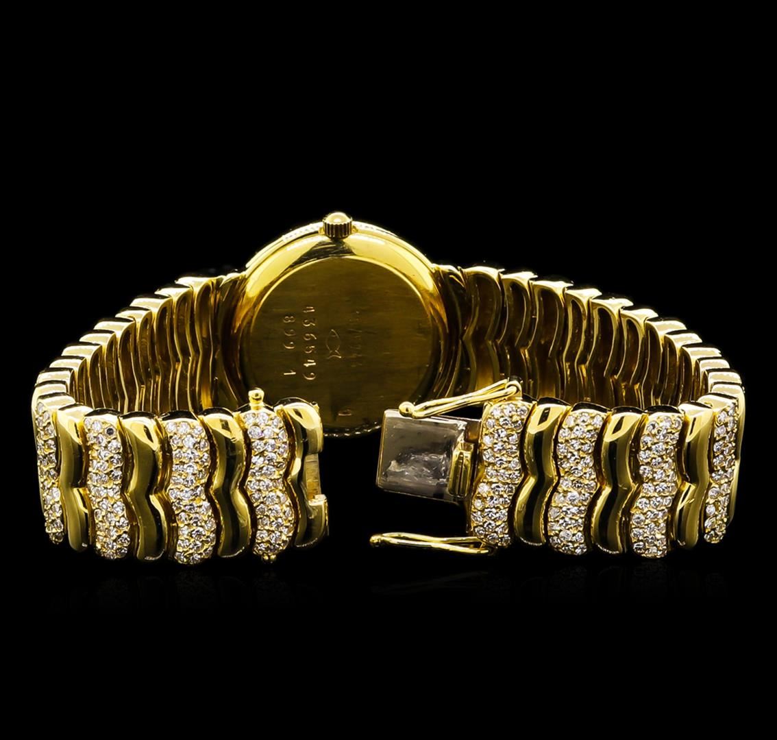 One ladies, Chopard Diamond wrist watch electronically tested 18KT yellow gold, Case: 23mm, Case Back: space available for engraving, Crown: scalloped, Bezel: diamond set, Crystal: synthetic sapphire, Circa: 1980's.Movement: quartz, Chopard signed Dial: mother of pearl, with baton narrow hands, Chopard Bracelet: 18KT yellow gold, alternating yellow gold and diamond set links, Condition: G-6 Extra Fine. Bright polish finish. Six and one quarter inch length. Chopard signed concealed clasp, with twin safeties. Containing: Approximately Six Hundred Fifty round brilliant & single cut diamonds approximate total weight = 5.00ct. Graded in the settings. Clarity: VVS-2 to VS-2. Color: F - G. Total Weight of Diamonds 5.00ct. Total Weight of Watch 83.06gm. AIG Appraised at $28,000.00.