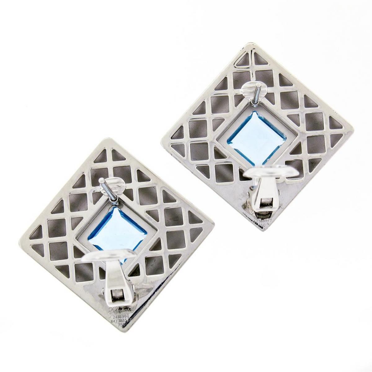 A pair of large 18k white gold earrings made by Chopard featuring a pair of square step cut natural blue topaz stones bezel set atop a smooth pyramid design. The earrings attach with posts and omega closures, measure approximately 24.0mm square, and weigh a total of 25.5 grams.