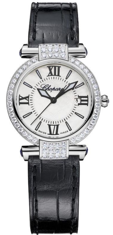 Model: 384238-1001 - CASE = [Material:18kt White Gold], [Case Diameter:28], [Case Thickness:9mm], [Case Back:Solid], [Water Resistant:50 Meters - 150 Feet], [Crystal:Scratch Resistant Sapphire],; DIAL = [Color:Mother of Pearl set with 151 Gemstones (.80 ct.)],; MOVEMENT = [Type:Battery Powered Quartz],; BAND = [Clasp:Tang Buckle], [Type:Black Crocodile Leather], (Usually ships in 1 to 2 weeks.)