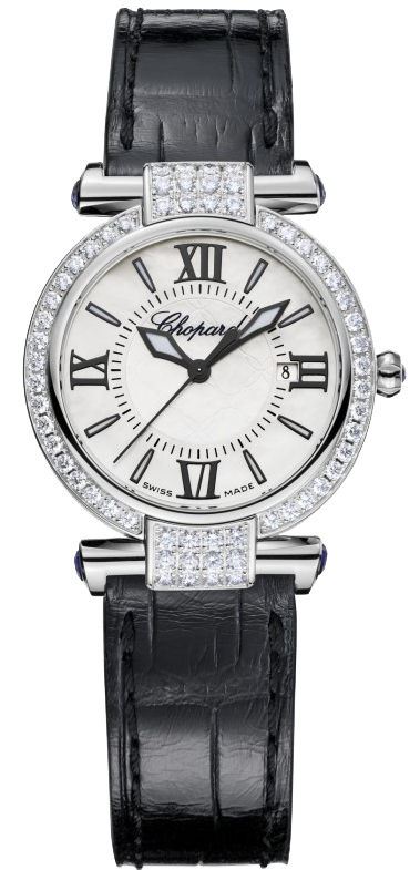 Model: 384238-1001 - CASE = [Material:18kt White Gold], [Case Diameter:28], [Case Thickness:9mm], [Case Back:Solid], [Water Resistant:50 Meters - 150 Feet], [Crystal:Scratch Resistant Sapphire], DIAL = [Color:Mother of Pearl set with 151 Gemstones (.80 ct.)], MOVEMENT = [Type:Battery Powered Quartz], BAND = [Clasp:Tang Buckle], [Type:Black Crocodile Leather], (Usually ships in 1 to 2 weeks.)