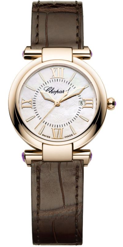 Model: 384238-5001 - CASE = [Material:18kt Rose Gold], [Case Diameter:28], [Case Thickness:9mm], [Case Back:Solid], [Water Resistant:50 Meters - 150 Feet], [Crystal:Scratch Resistant Sapphire], DIAL = [Color:Mother of Pearl], MOVEMENT = [Type:Battery Powered Quartz], BAND = [Clasp:Tang Buckle], [Type:Alligator/Crocodile Leather Brown], (Usually ships in 1 to 2 weeks.)