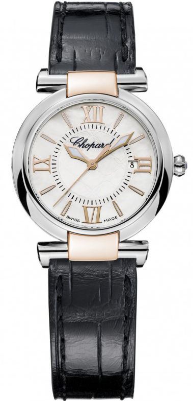Model: 388541-6001 - CASE = [Material:Stainless Steel & Gold], [Case Diameter:28], [Case Thickness:9mm], [Case Back:Solid], [Water Resistant:50 Meters - 150 Feet], [Crystal:Scratch Resistant Sapphire], DIAL = [Color:Mother of Pearl], MOVEMENT = [Type:Battery Powered Quartz], BAND = [Clasp:Tang Buckle], [Type:Alligator/Crocodile Leather Black], (In Stock - Ready to ship.)