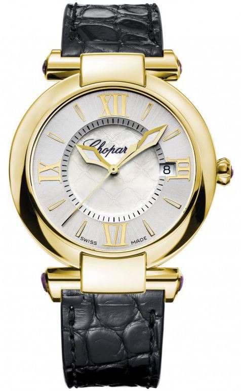 Model: 384221-0001 - CASE = [Material:18kt Yellow Gold], [Case Diameter:36], [Case Thickness:9mm], [Case Back:Solid], [Water Resistant:50 Meters - 150 Feet], [Crystal:Scratch Resistant Sapphire], DIAL = [Color:Silver], MOVEMENT = [Type:Battery Powered Quartz], BAND = [Clasp:Tang Buckle], [Type:Alligator/Crocodile Leather Black], (Usually ships in 1 to 2 weeks.)