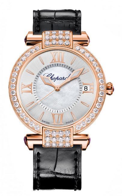Model: 384822-5002 - CASE = [Material:18kt Rose Gold], [Case Diameter:36], [Bezel:Fixed with Diamonds], [Case Back:Skeleton], [Water Resistant:50 Meters - 165 Feet], [Crystal:Scratch Resistant Sapphire], DIAL = [Color:Silver], MOVEMENT = [Type:Automatic], [Crown:Push In], BAND = [Clasp:Tang], [Type:Black Alligator Leather], (Usually ships in 1 to 2 weeks.)