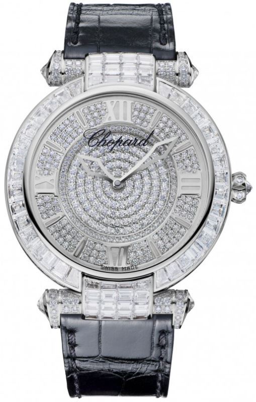 Model: 384239-1003 - CASE = [Material:18kt White Gold], [Case Diameter:40], [Case Thickness:9mm], [Case Back:Transparent], [Water Resistant:50 Meters - 150 Feet], [Crystal:Scratch Resistant Sapphire], DIAL = [Color:Diamonds], MOVEMENT = [Type:Automatic Self Winding], BAND = [Clasp:Tang Buckle], [Type:Alligator/Crocodile Leather Black], (Usually ships in 1 to 2 weeks.)