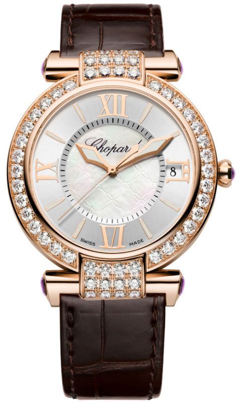 Model: 384241-5003 - CASE = [Material:18kt Rose Gold], [Case Diameter:40], [Case Thickness:10.5mm], [Case Back:Transparent], [Water Resistant:50 Meters - 150 Feet], [Crystal:Scratch Resistant Sapphire], DIAL = [Color:Mother of Pearl], MOVEMENT = [Type:Automatic Self Winding], BAND = [Clasp:Tang Buckle], [Type:Alligator/Crocodile Leather Brown],  (Usually ships in 1 to 2 weeks.)
