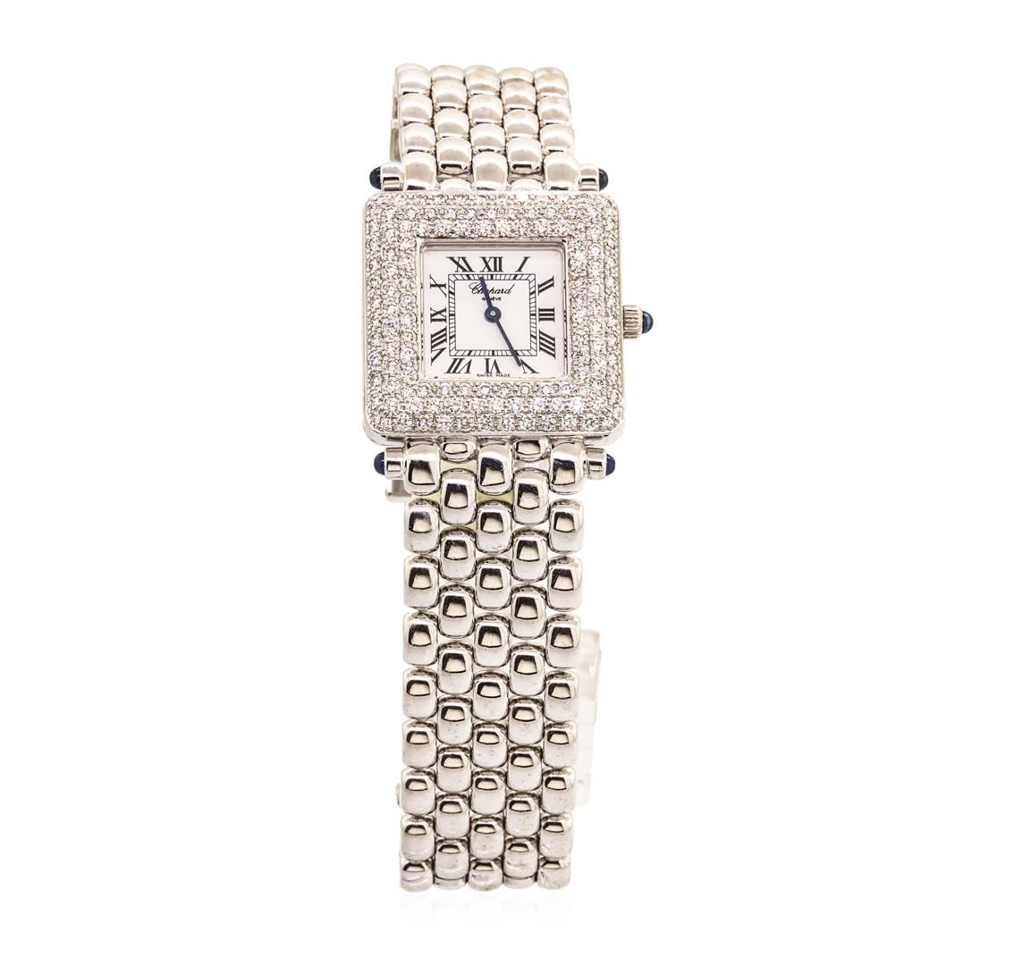 One lady's Chopard Classique 18KT white gold wristwatch with an attached, matching bracelet. Serial #: 539390 490 1, Model #: 106889. Crown: fluted, sapphire-set pull-out. Bezel: diamond encrusted white gold. Crystal: synthetic sapphire. Movement: quartz. Dial: square white with black roman numerals and pointed baton type, blued-steel hands. Bracelet: matching, double deployment clasp. The watch has a total weight of 119.0 grams.