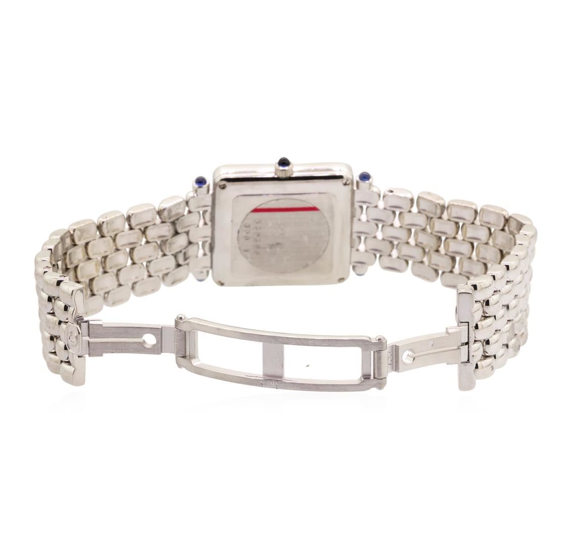 One lady's Chopard Classique 18KT white gold wristwatch with an attached, matching bracelet. Serial #: 539390 490 1, Model #: 106889. Crown: fluted, sapphire-set pull-out. Bezel: diamond encrusted white gold. Crystal: synthetic sapphire. Movement: quartz. Dial: square white with black roman numerals and pointed baton type, blued-steel hands. Bracelet: matching, double deployment clasp. The watch has a total weight of 119.0 grams.