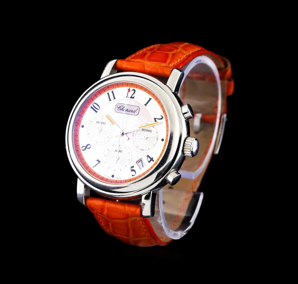 One, Chopard Mille Miglia Limited Edition Elton John Aids Foundation Chronograph wristwatch, Stainless Steel Case: 39mm, Water Resistant: 100 meters / 330 feet, Case Back: synthetic sapphire exposition back, secured by eight set screws, the case back frame is engraved with the manufacturers model name, and ID information, the inside of the exposition back is stamped with ELTON JOHN AIDS FOUNDATION, and a signature of Elton John, Crown: scalloped, Fixed Bezel: polished, Crystal: synthetic sapphire. Watch Production Limited to 2000 numbered pieces. Chopard Movement: thirty seven jewel automatic, Chopard signed Dial: mother of pearl center, with orange color luminous hands, Case Ring: indices, Chronograph Functions: three sub dials for continuous seconds, minutes and hours, Bracelet: Chopard Orange color saddle stitched leather strap, with a Chopard buckle clasp, Condition: G-7 Near Mint. Seven and one half inch length, adjustable. Total Weight of Watch103.84gm. AIG Appraised at $4,450.00.