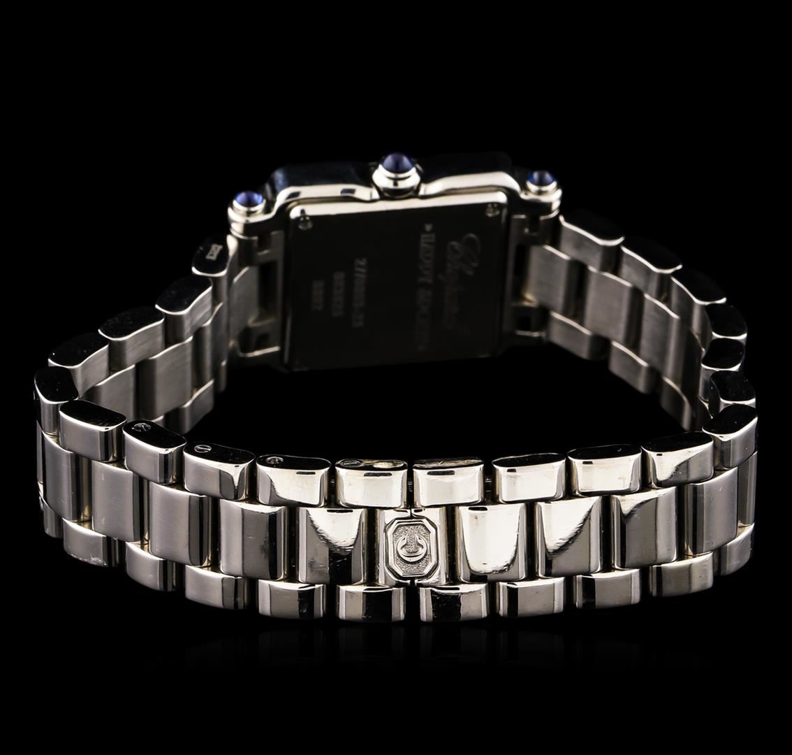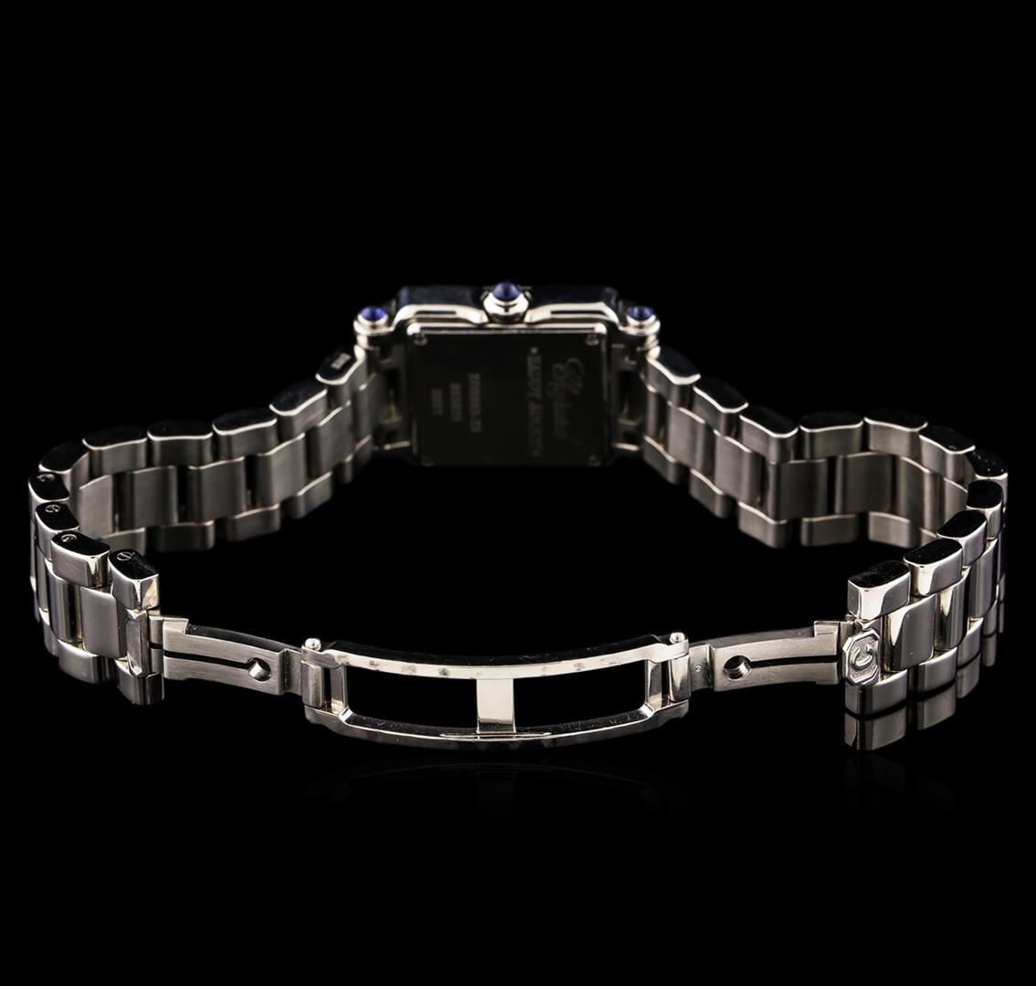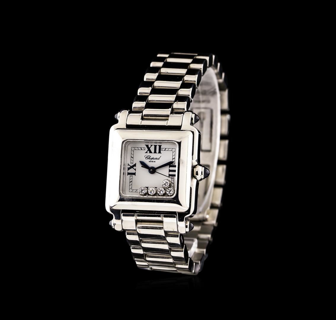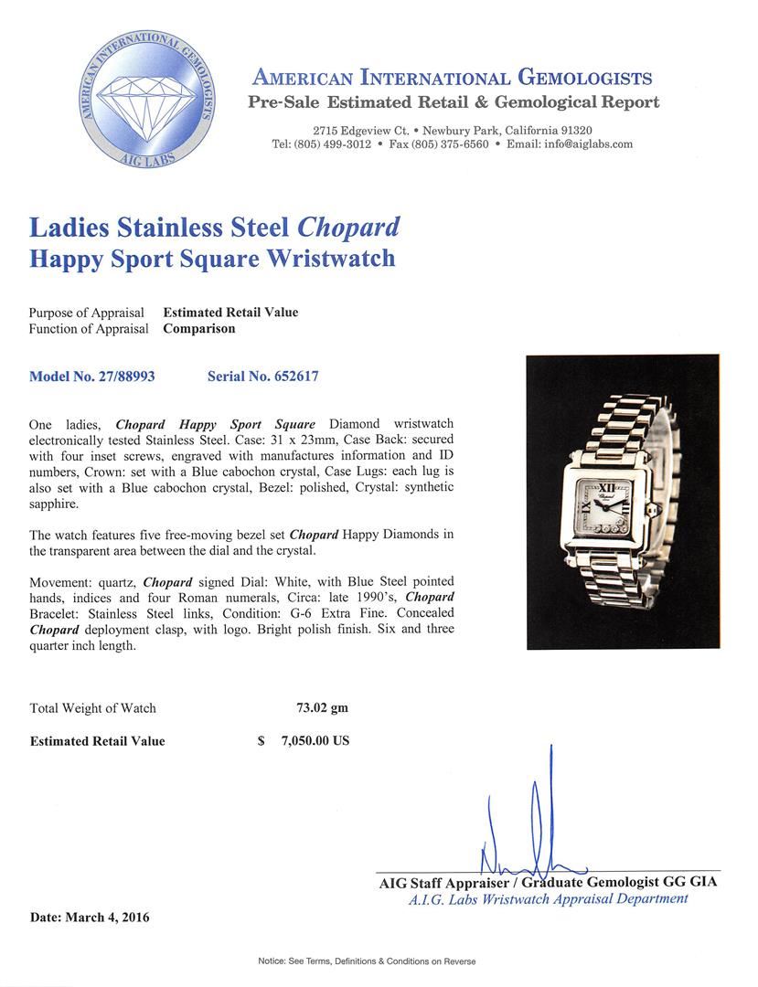 One ladies, Chopard Happy Sport Square Diamond wristwatch electronically tested Stainless Steel. Case: 31 x 23mm, Case Back: secured with four inset screws, engraved with manufactures information and ID numbers, Crown: set with a Blue cabochon crystal, Case Lugs: each lug is also set with a Blue cabochon crystal, Bezel: polished, Crystal: synthetic sapphire. The watch features five free-moving bezel set Chopard Happy Diamonds in the transparent area between the dial and the crystal. Movement: quartz, Chopard signed Dial: White, with Blue Steel pointed hands, indices and four Roman numerals, Circa: late 1990's, Chopard Bracelet: Stainless Steel links, Condition: G-6 Extra Fine. Concealed Chopard deployment clasp, with logo. Bright polish finish. Six and three quarter inch length. Total Weight of Watch 73.02gm. AIG Appraised at $7,050.00.