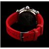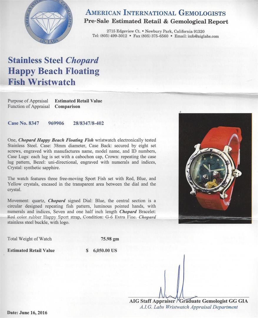 One Chopard Happy Beach Floating Fish wristwatch electronically tested Stainless Steel. Case: 38mm diameter, Case Back: secured by eight set screws, engraved with manufactures name, model name, and ID numbers, Case Lugs: each lug is set with a cabochon cap, Crown: repeating the case lug pattern, Bezel: uni-directional, engraved with numerals and indices, Crystal: synthetic sapphire. The watch features three free-moving Sport Fish set with Red, Blue, and Yellow crystals, encased in the transparent area between the dial and the crystal. Movement: quartz, Chopard signed Dial: Blue, the central section is a circular designed repeating fish pattern, luminous pointed hands, with numerals and indices, Seven and one half inch length Chopard Bracelet: Red color rubber Happy Sport strap, Condition: G-6 Extra Fine. Chopard stainless steel buckle, with logo. Total Weight of Watch 75.98gm. AIG Appraised at $6,050.00.