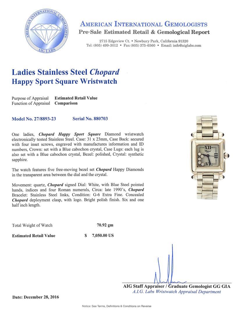 One ladies, Chopard Happy Sport Square Diamond wristwatch electronically tested Stainless Steel. Case: 31 x 23mm, Case Back: secured with four inset screws, engraved with manufactures information and ID numbers, Crown: set with a Blue cabochon crystal, Case Lugs: each lug is also set with a Blue cabochon crystal, Bezel: polished, Crystal: synthetic sapphire. The watch features five free-moving bezel set Chopard Happy Diamonds in the transparent area between the dial and the crystal. Movement: quartz, Chopard signed Dial: White, with Blue Steel pointed hands, indices and four Roman numerals, Circa: late 1990's, Chopard Bracelet: Stainless Steel links, Condition: G-6 Extra Fine. Concealed Chopard deployment clasp, with logo. Bright polish finish. Six and one half inch length. Total Weight of Watch 70.92gm. AIG Appraised at $7,050.00.