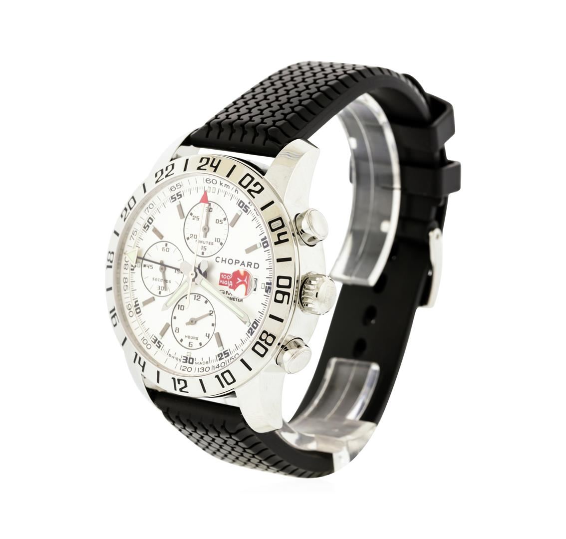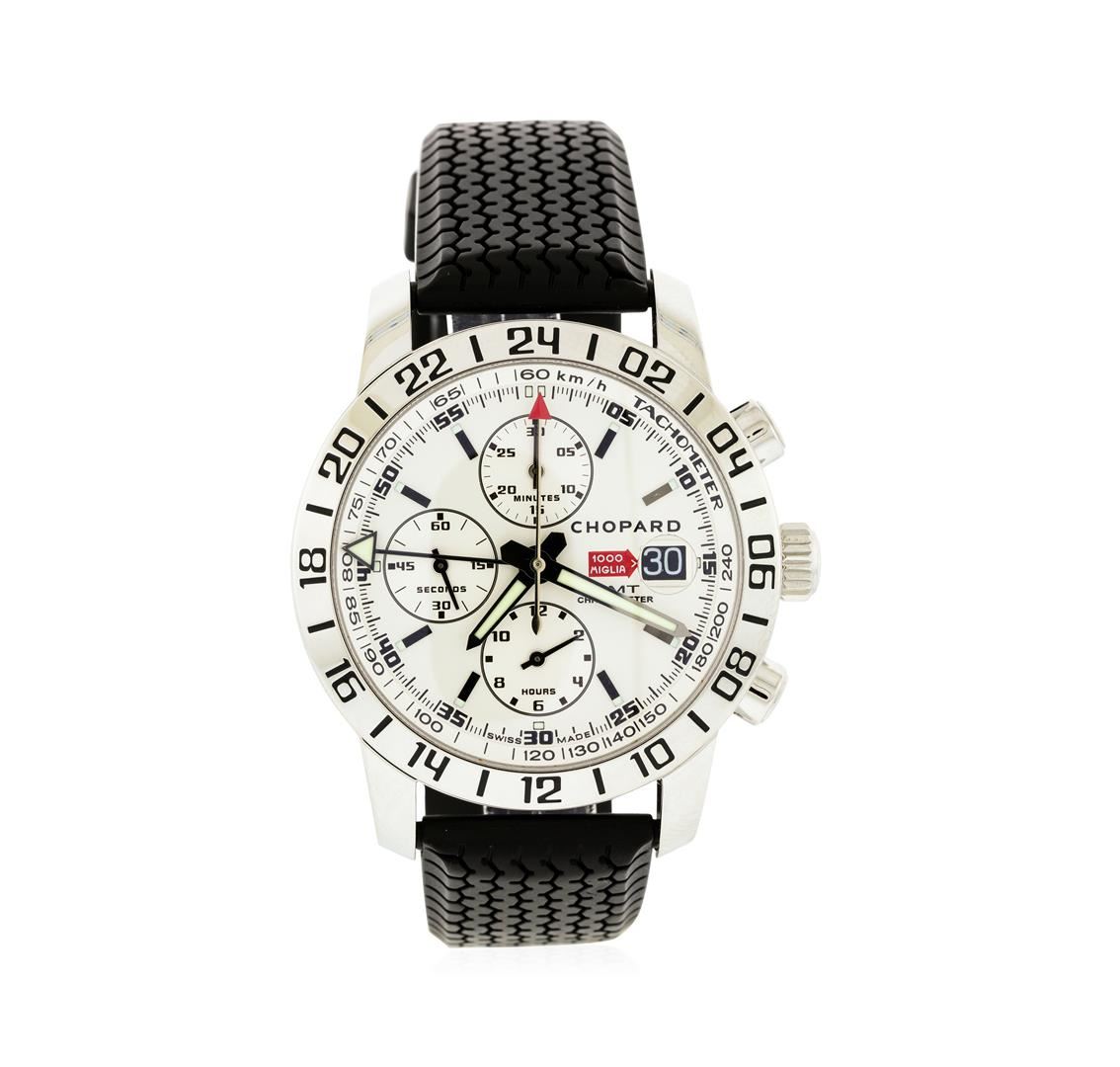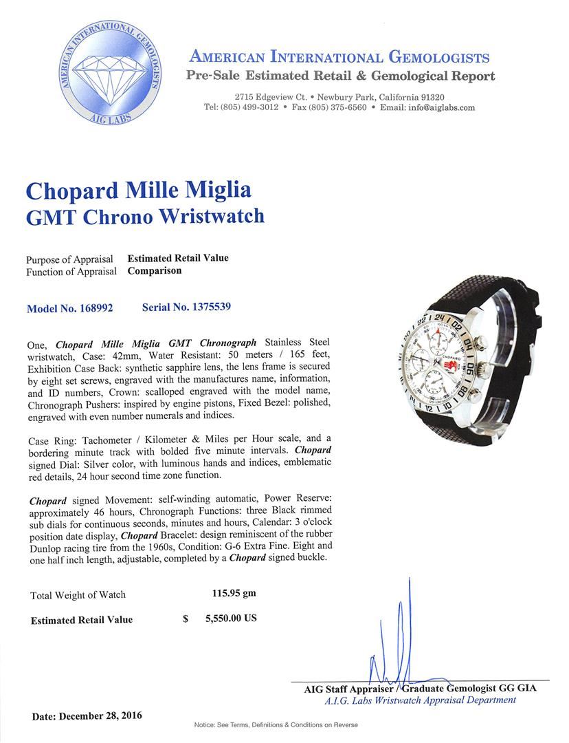 One, Chopard Mille Miglia GMT Chronograph Stainless Steel wristwatch, Case: 42mm, Water Resistant: 50 meters / 165 feet, Exhibition Case Back: synthetic sapphire lens, the lens frame is secured by eight set screws, engraved with the manufactures name, information, and ID numbers, Crown: scalloped engraved with the model name, Chronograph Pushers: inspired by engine pistons, Fixed Bezel: polished, engraved with even number numerals and indices. Case Ring: Tachometer / Kilometer & Miles per Hour scale, and a bordering minute track with bolded five minute intervals. Chopard signed Dial: Silver color, with luminous hands and indices, emblematic red details, 24 hour second time zone function. Chopard signed Movement: self-winding automatic, Power Reserve: approximately 46 hours, Chronograph Functions: three Black rimmed sub dials for continuous seconds, minutes and hours, Calendar: 3 o'clock position date display, Chopard Bracelet: design reminiscent of the rubber Dunlop racing tire from the 1960s, Condition: G-6 Extra Fine. Eight and one half inch length, adjustable, completed by a Chopard signed buckle. Total Weight of Watch 115.95gm. AIG Appraised at $5,550.00.