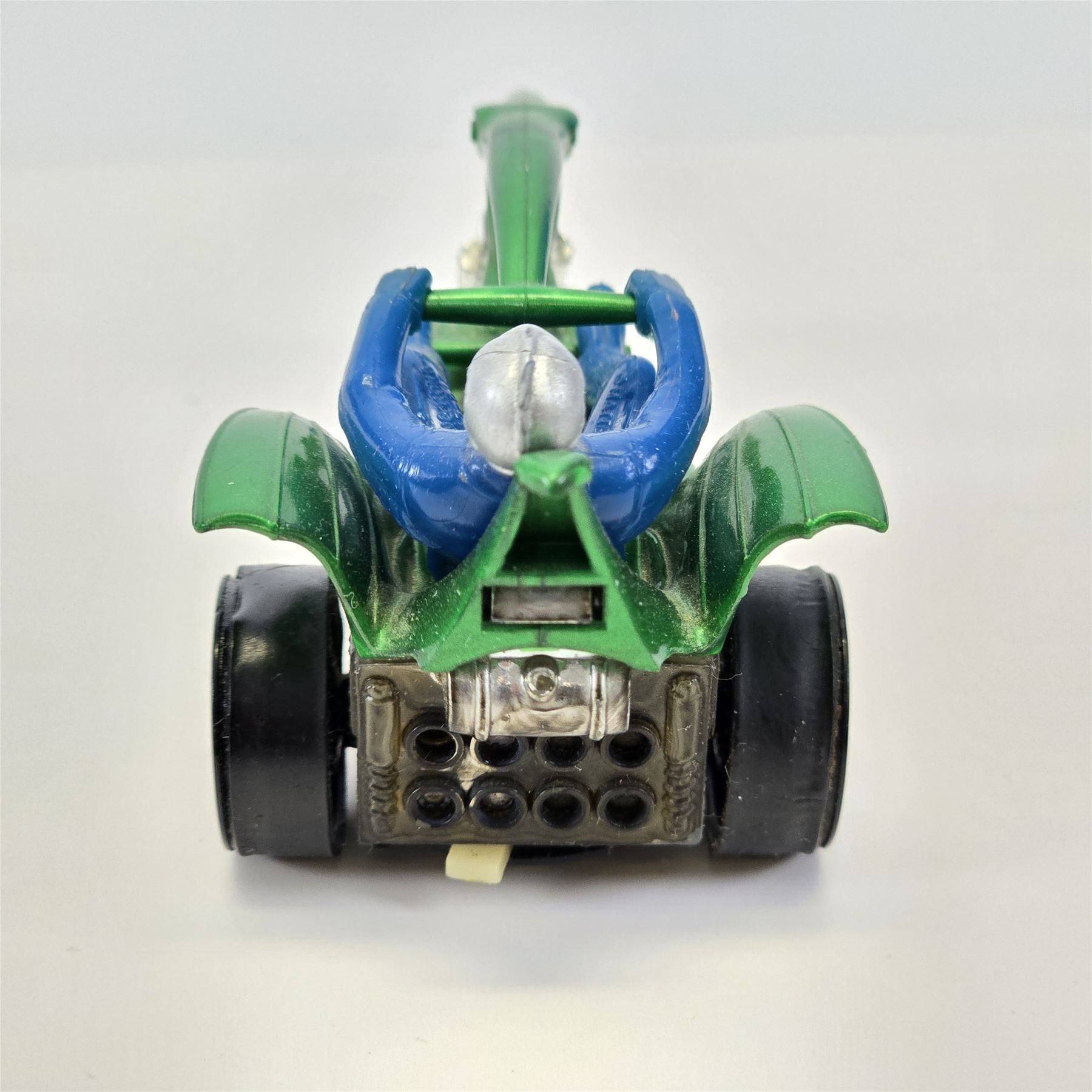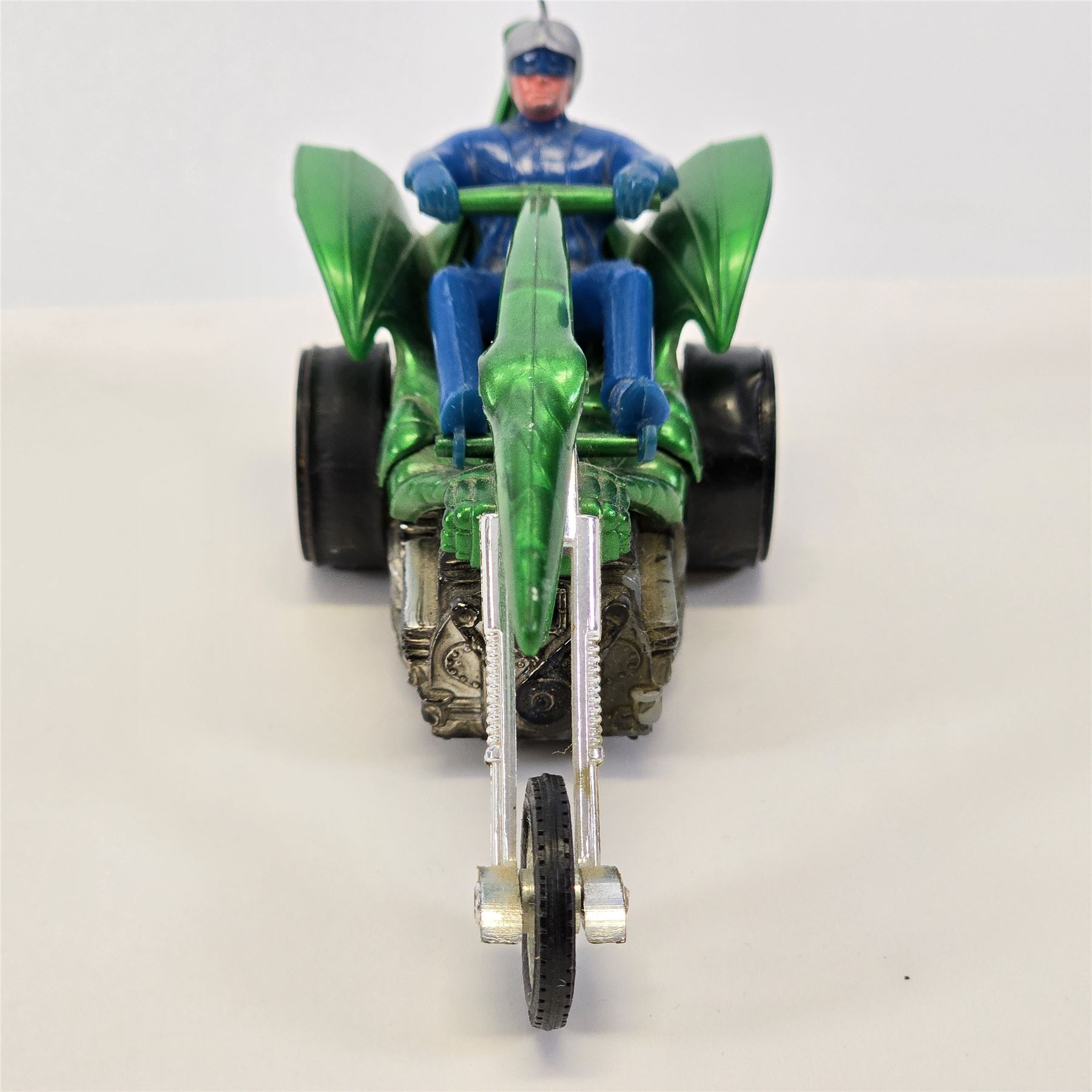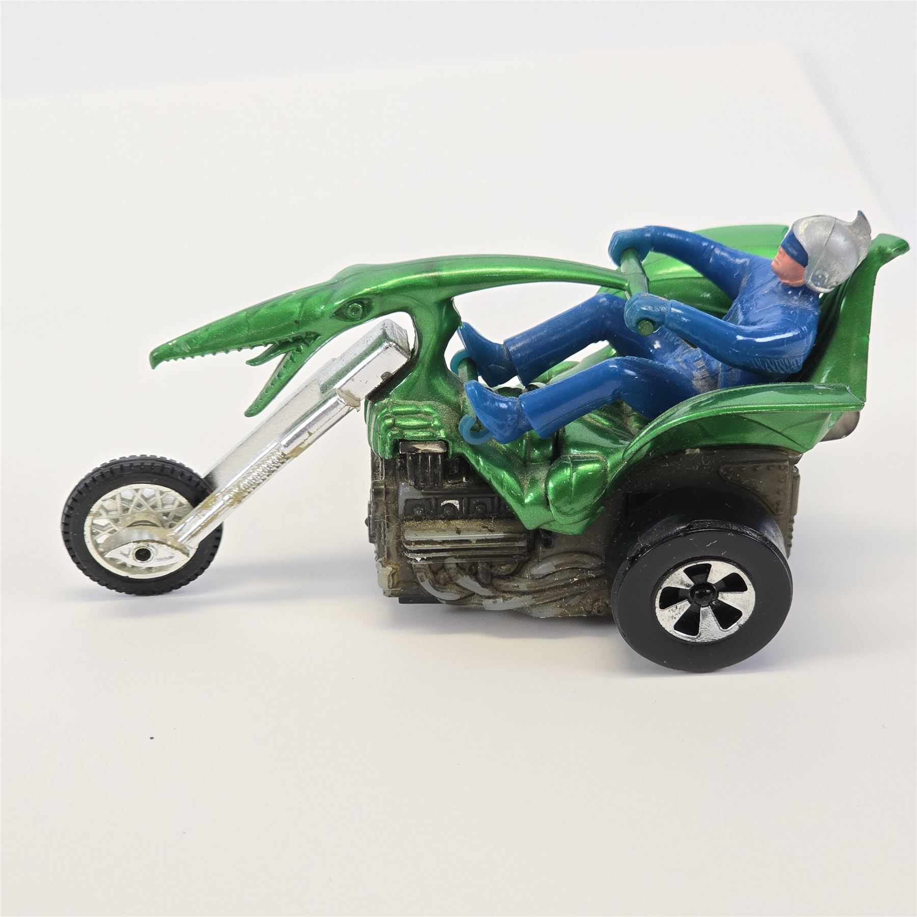 Overall nice condition with typical wear to chrome finish. Plastics appear all intact. Blue Fin rider is intact. Wheels are in nice condition. Bumper claw is missing.