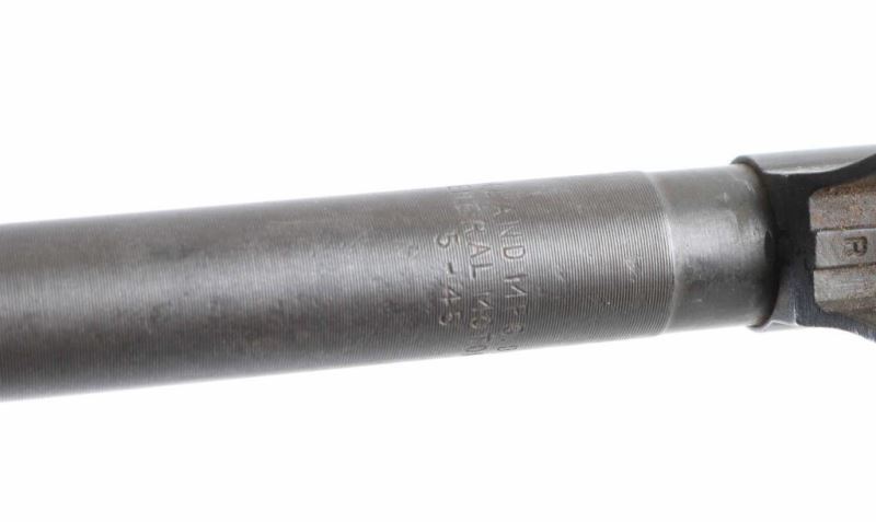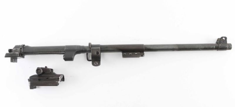 SN: 7381723 is missing the middle section of the receiver, with front and rear stubs only. Includes adjustable rear sight, barrel assembly with front sight and bayonet lug type band. Bore is good to very good condition, with crisp rifling. External surfaces are medium gray parkerized, good or better condition, about 75% coverage, with scrapes and rub marks showing bare metal. Bayonet lug band is tight on barrel and does not slide freely.