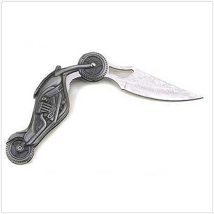 Chopper Pocket Knife **|**|** Chopper Pocket Knife - 12865 - Motorcycle fans, this knifes for you! Bold styling features sleek chopper figural handle and a gleaming blade etched with a racetrack design for a look no bona-fide biker can resist. Weight 0.1 lb. Stainless steel and zinc alloy. 4 x " x 1" high; 8" long when opened."