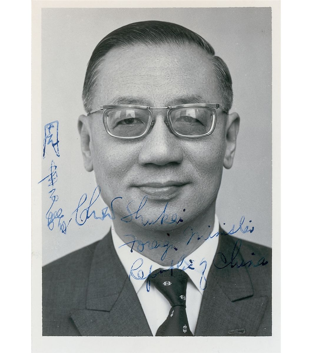 Republic of China’s US ambassador during the late 1960s. Vintage glossy 3.5 x 5 photo, signed and inscribed in blue ink “Chow Shukei, Foreign Minister, Republic of China,” and also signed in Chinese. With moderate scattered surface impressions, primarily visible at an angle, and slightly irregular ink adhesion to signature, otherwise fine condition.