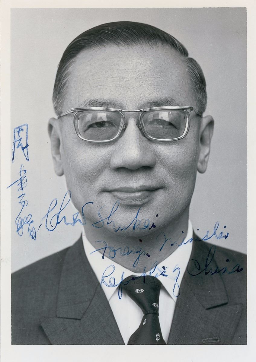Republic of China’s US ambassador during the late 1960s. Vintage glossy 3.5 x 5 photo, signed and inscribed in blue ink “Chow Shukei, Foreign Minister, Republic of China,” and also signed in Chinese. With moderate scattered surface impressions, primarily visible at an angle, and slightly irregular ink adhesion to signature, otherwise fine condition.