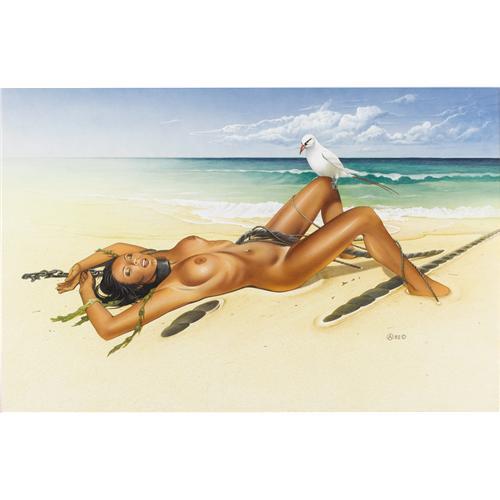 <B>Chris Achilleos - "Stranger on the Shore" Paperback Cover Painting Original Art (1982).</B></I> It seems a beautiful slave girl has just washed ashore in this delightfully tactile painting detailed by fantasy master Chris Achilleos. This splendid painting has an image area that measures 30" x 19.5", and the art is framed and in Excellent condition.<BR><BR><b>Shipping:</b> Framed (<a target="_blank" href="http://www.heritageauctions.com/common/shipping.php">view shipping information</a>)
