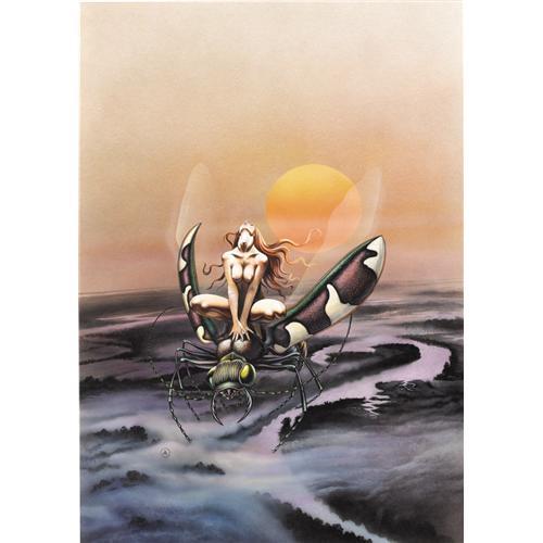 <B>Chris Achilleos - "Will-O-The-Wisp" Paperback Cover Painting Original Art (Corgi, 1976).</B></I> "Puritan or Witch? Beautiful or bestial? Who were the Glubbings?" This compelling and evocative science fiction/fantasy cover scene for Thomas Burnett Swan's novel was painted by Chris Achilleos, world renowned illustrator. Achilleos' career has spanned over three decades and during that time he has painted hundreds of superb cover images for the fantasy classics of such legends as Robert E. Howard, Edgar Rice Burroughs, Michael Moorcock, and J. R. R. Tolkien, and many others. This spectacular painting has an image area that measures 21" x 30", and the art is framed and in Excellent condition.<BR><BR><b>Shipping:</b> Framed (<a target="_blank" href="http://www.heritageauctions.com/common/shipping.php">view shipping information</a>)