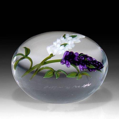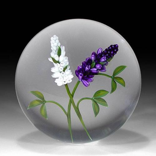 Chris Buzzini 1998 "Lilacs" paperweight, containing a spray of white lilacs and a spray of purple lilacs, on stems, with clusters of green leaves, over clear ground. Signed/dated. Edition #24 of a limited edition 25. Diameter 3 3/8".