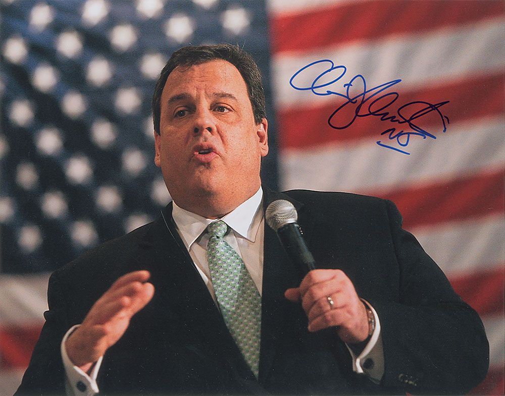 Color satin-finish 14 x 11 photo of Christie addressing a crowd at a rally, signed in blue felt tip. In fine condition.