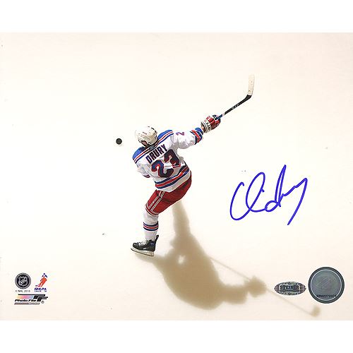 Chris Drury Rangers White Jersey Slap Shot Overhead Horizontal 8x10 Photo