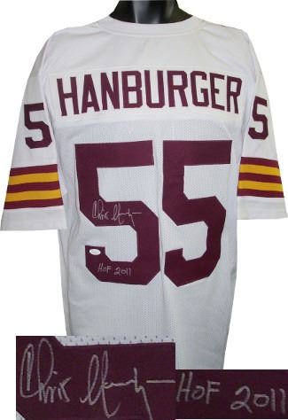 Chris Hanburger was drafted by the Redskins in the 18th and final round of the 1965 NFL Draft. As a pro, he was considered as one of the best linebackers of his era and was elected to the Pro Bowl nine times during his career, the most in Washington Redskin history. Hanburger earned the nickname "The Hangman" due to his penchant for clothesline tackles. He was a Four-time First-team All-Pro in 1972, 1973, 1975 and 1976 and a Second-team All-Pro in 1969 and 1974. Chris Hanburger was elected into the NFL Hall of Fame in 2011. Chris Hanburger Washington Redkins has hand signed this unlicensed TB custom-prostyle White jersey with twill stitched nameplate and numbers with HOF 2011 inscription. JSA Hologram and Certificate of Authenticity.