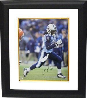 Chris Johnson, running back for the Tennessee Titans, had a break out rookie season. A 1st round draft pick, 24th overall, out of East Carolina, Johnson rushed for 1,228 Yards and 9 rushing TDs, while averaging 4.9 YPC during his rookie campaign, in addition to catching 43 passes for 280 yards. Johnson was selected to the Pro Bowl in just his first season in the NFL. Chris Johnson has hand signed this 16x20 Tennessee Titans action photograph. FI Holo, Photo from the Signing, and Certificate of Authenticity from Athlon Sports. Custom White Mat and Premium Black Framed as shown. Private Signing in Brentwood, Tennessee on December 10th, 2009.