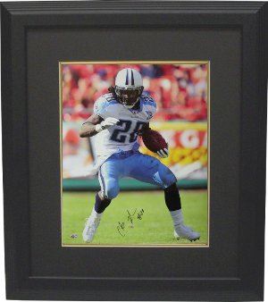 Chris Johnson, running back for the Tennessee Titans, had a break out rookie season. A 1st round draft pick, 24th overall, out of East Carolina, Johnson rushed for 1,228 Yards and 9 rushing TDs, while averaging 4.9 YPC during his rookie campaign, in addition to catching 43 passes for 280 yards. Johnson was selected to the Pro Bowl in just his first season in the NFL. Chris Johnson has hand signed this Tennessee Titans 16x20 Photo. Custom Black Mat and Black Frame as shown. FI Holo, 4x6 Photo from the Signing, and Certificate of Authenticity from Athlon Sports. Private Signing in Brentwood, Tennessee on December 10th, 2009.