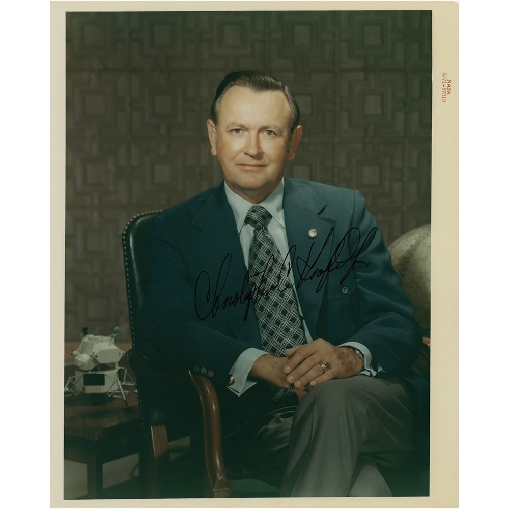Official color glossy 8 x 10 red-numbered NASA photo of Kraft seated beside a model of the Lunar Module, neatly signed in black ink, "Christopher C. Kraft, Jr." Reverse bears "A Kodak Paper" watermarks. In fine condition, with minor corner tip creases.