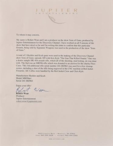 * Custom H&K 556A1 MR rifle used by Chris Kyle during the filming of "The Gun That Killed Bin Laden" episode of Sons of Guns television show. This rifle was used by Chris Kyle during the shooting scenes. close ups & serial number is visible on screen & comes with a letter verifying this was used by Chris Kyle during filming from the production company. SN 241-002963
