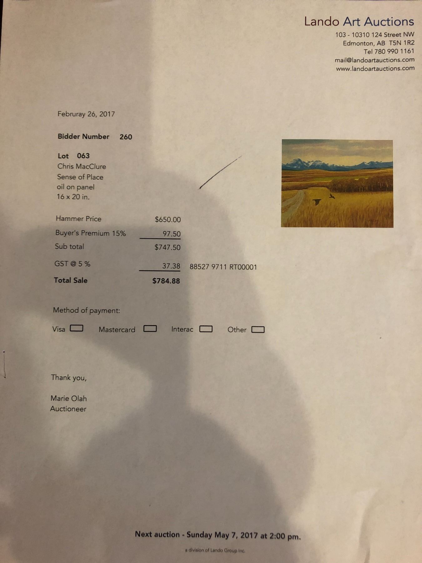 A full invoice should be emailed to the winner by the auctioneer within a day or two.