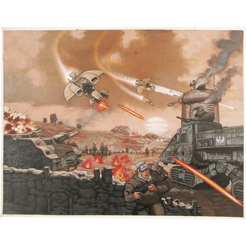 <B>Chris Moeller - Science Fiction Combat Illustration Original Art (1994).</B></I> Futuristic birds of prey deliver a deadly strike in this panoramic Chris Moeller scene from an unidentified project. This acrylic on board thriller has an overall size of 20" x 16", and the art is in Excellent condition. <BR><BR><b>Shipping:</b> Flat Material, Large (<a target="_blank" href="http://www.heritageauctions.com/common/shipping.php">view shipping information</a>)