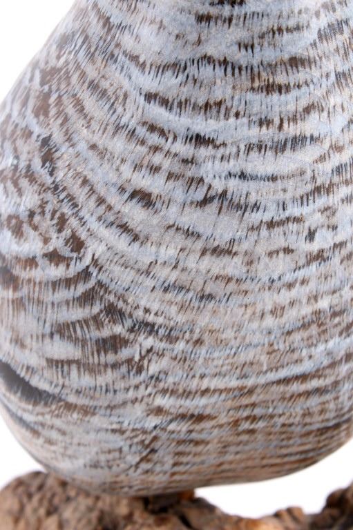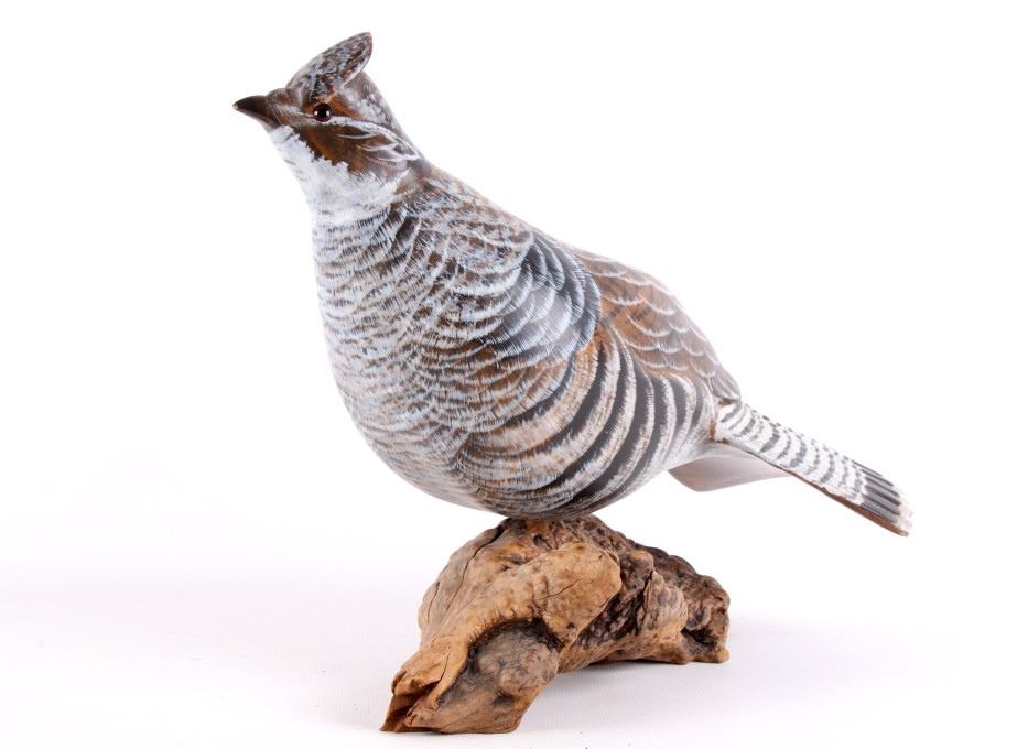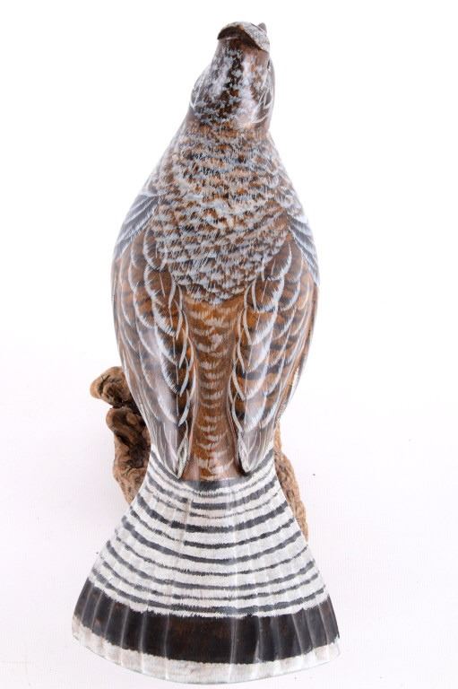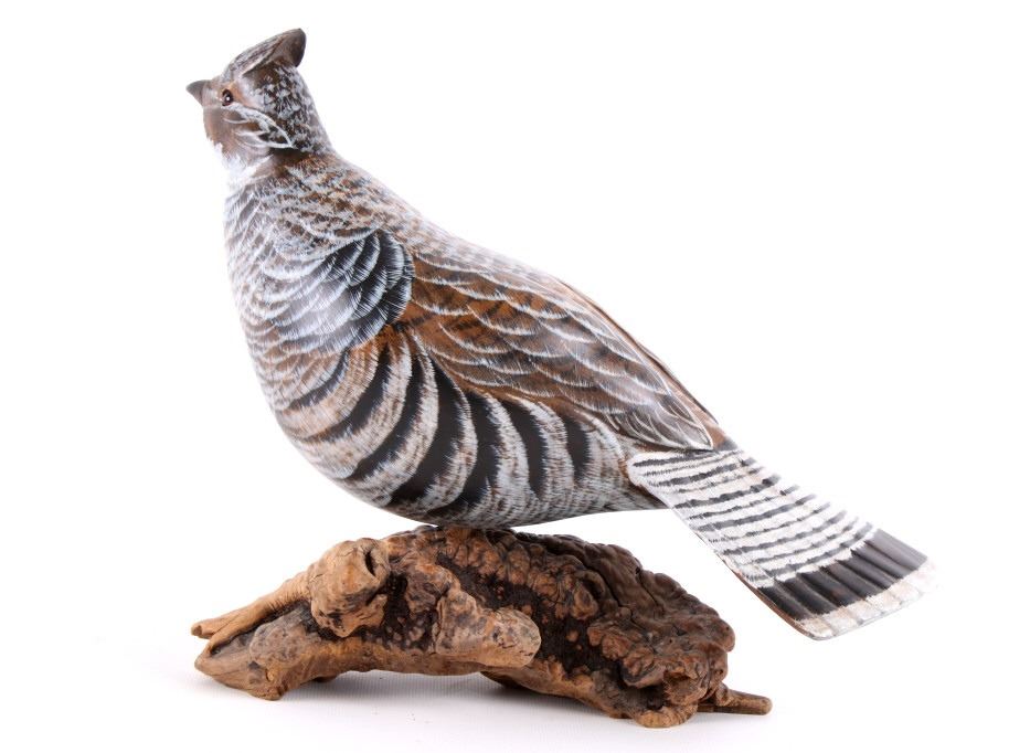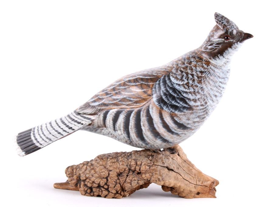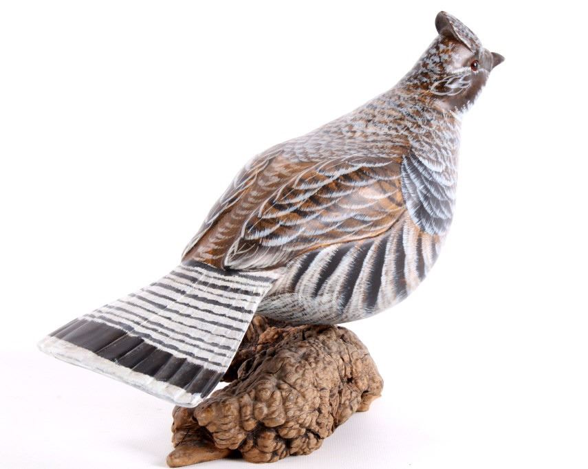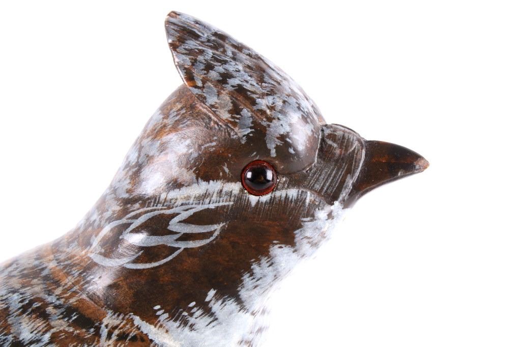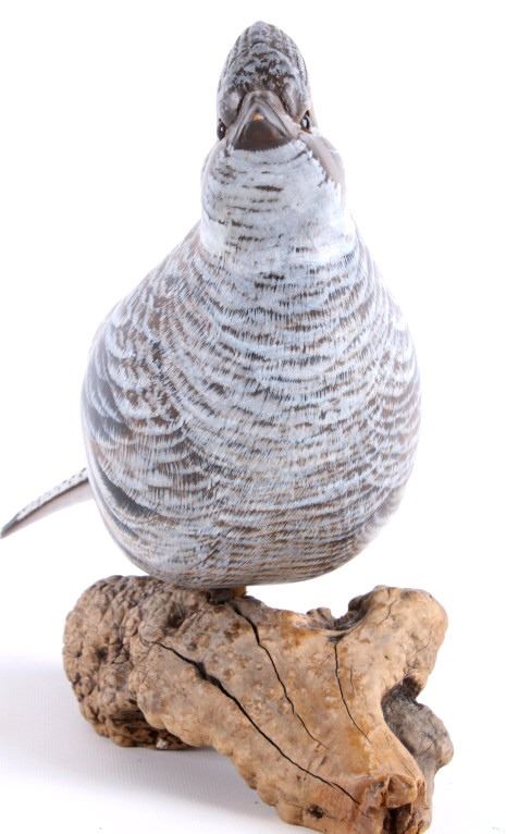 For your consideration, a hand carved and painted Scaled Quail. This beautifully detailed wood carving is signed by Bozeman artist, Chris Olson. In addition to creating wood carvings in his own studio, Olson carved works for Big Sky Carvers as a Master Carver. The quail shows a wonderful carved figure with a detailed hand painted coloration and feather patterns. The Scaled Quail is set onto a piece of highly charactered burl wood with contrasting light brown and black coloration. The bottom of the wood is signed, "Chris Olson". The piece shows excellent condition; it measures 15" L x 6" W x 10 1/2" T.