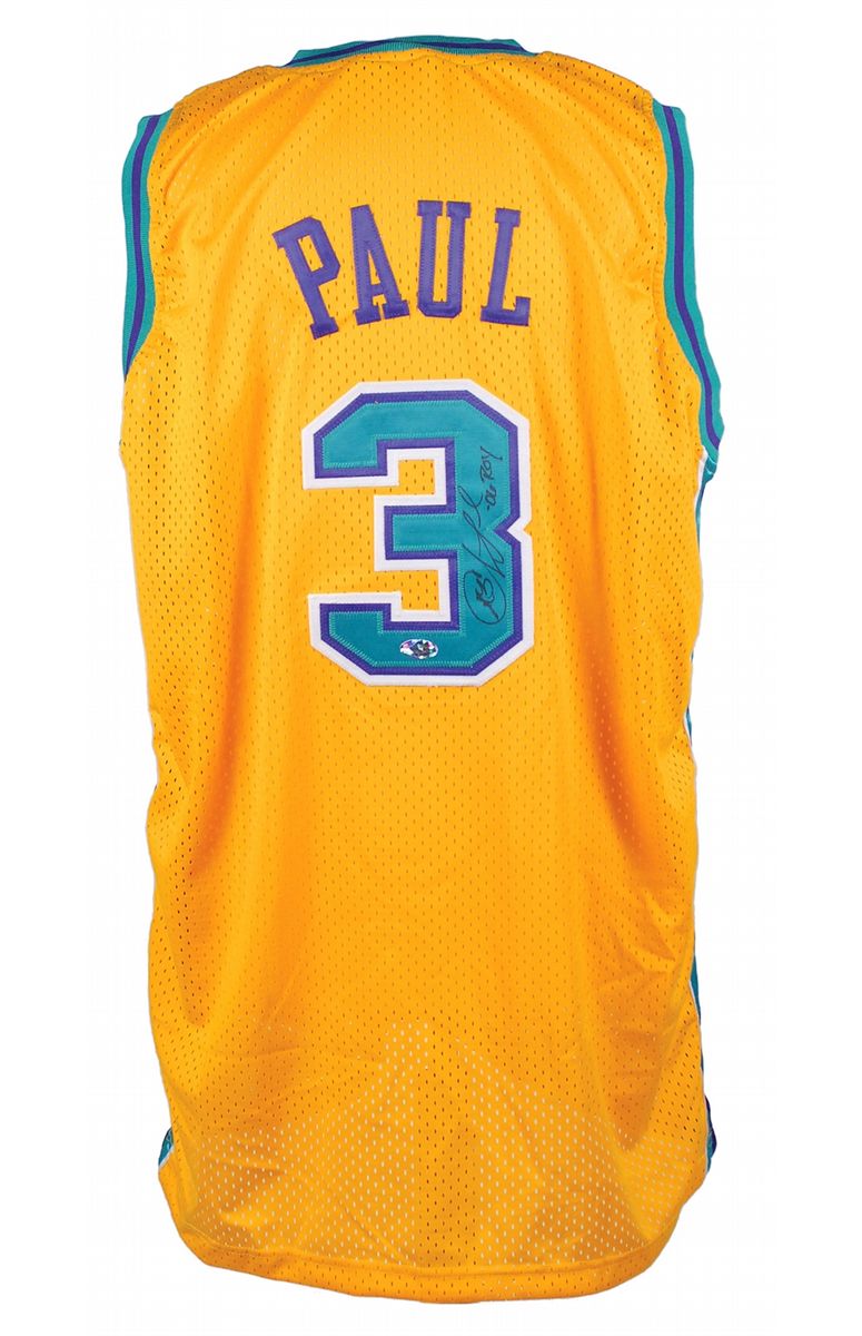Replica New Orleans Hornets basketball jersey, with sewn on letters and numbers, signed in black felt tip on the number on the back, “Chris Paul, 06 ROY.” In fine condition.