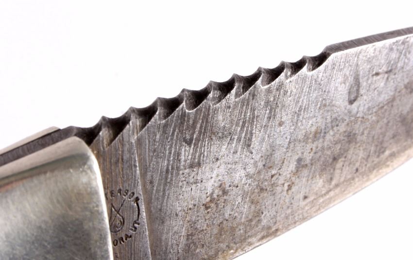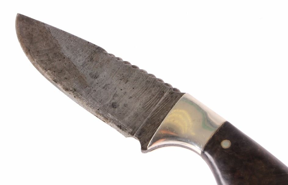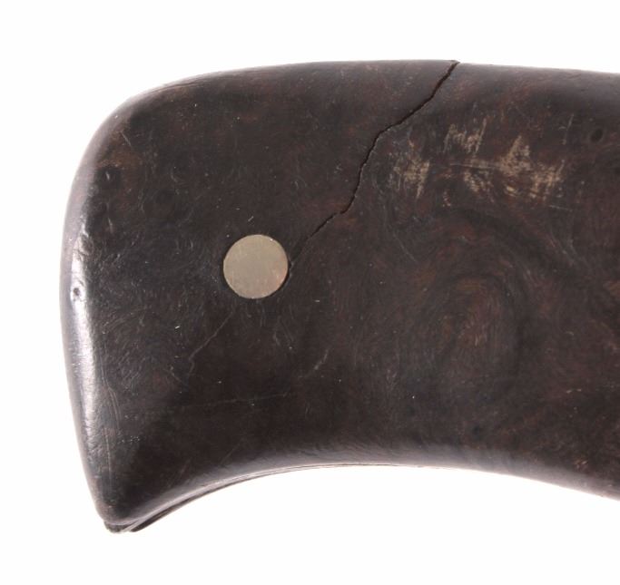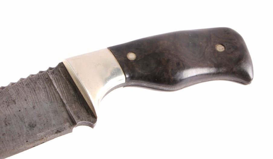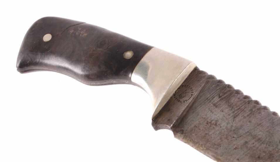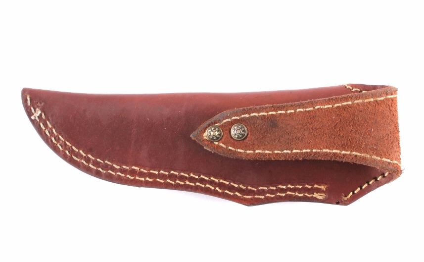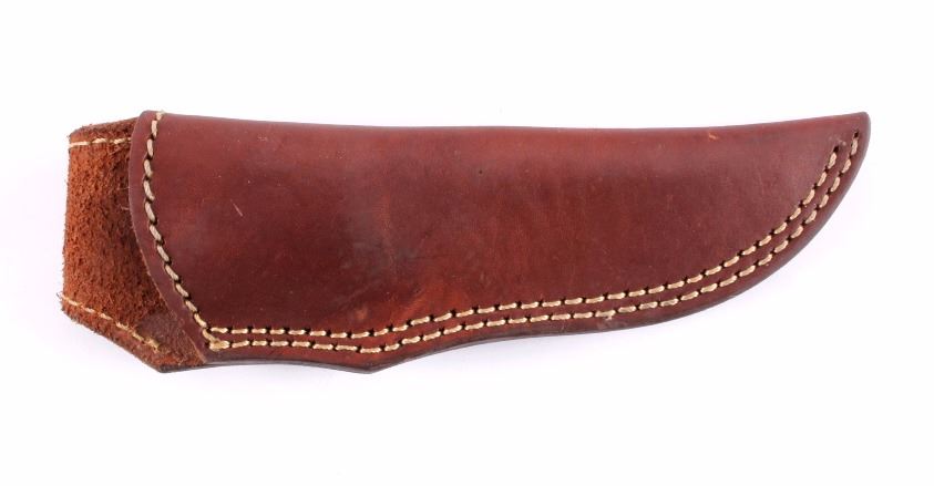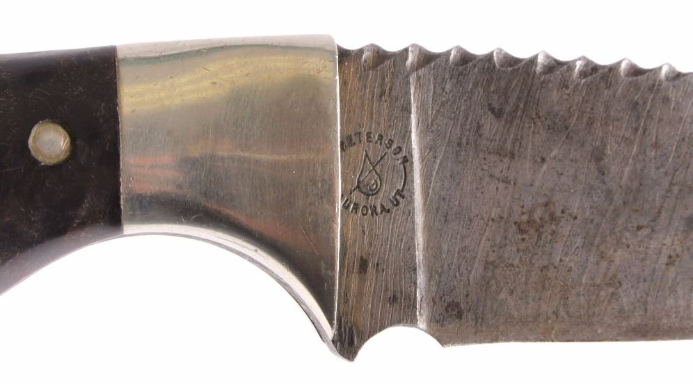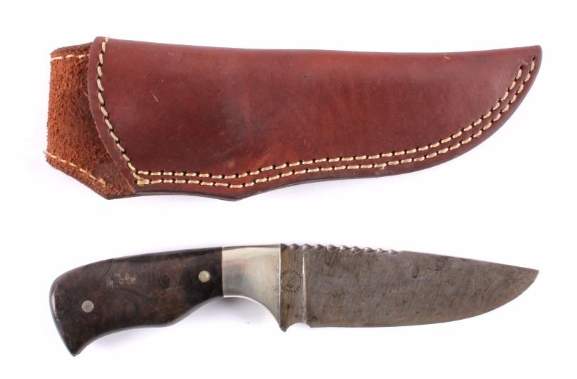 This is a custom Damascus knife with leather scabbard made by Chris Peterson. The knife features a forged Damascus steel blade and burl wood handle. The blade is marked "C. Peterson Aurora, UT". Peterson has been a knife maker in Utah for decades and some of his most sought after knives are made with meteorite. This knife shows good overall condition. There is a small crack in the burl wood handle as shown. The knife measures 8" with a 4" blade.