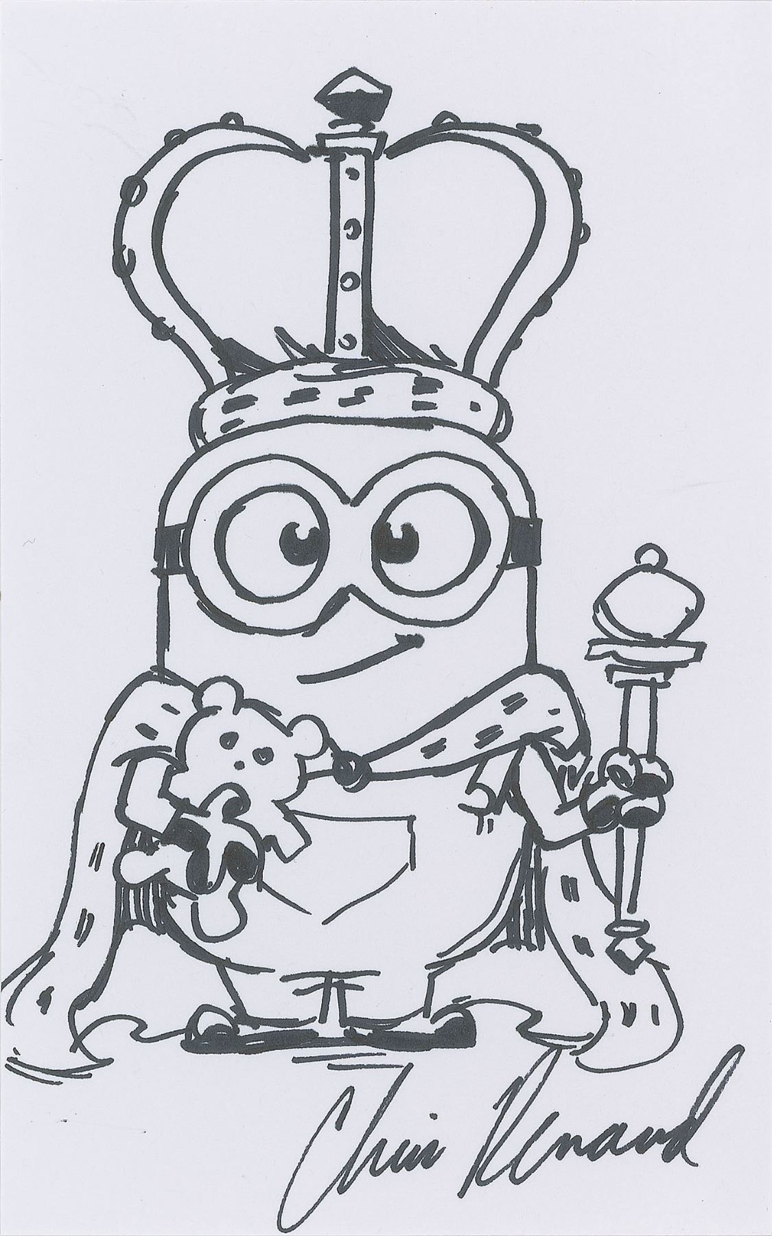 Terrific trio of original felt tip sketches by Chris Renaud on individual white 5 x 8 sheets, each signed by Renaud and depicting a character from the popular Despicable Me series: including: Gru the super villain with his striped scarf; a kingly Minion, with robe, crown, and scepter, holding a teddy bear; and a one-eyed Minion waving and yelling: “Bello!" In overall very fine condition.