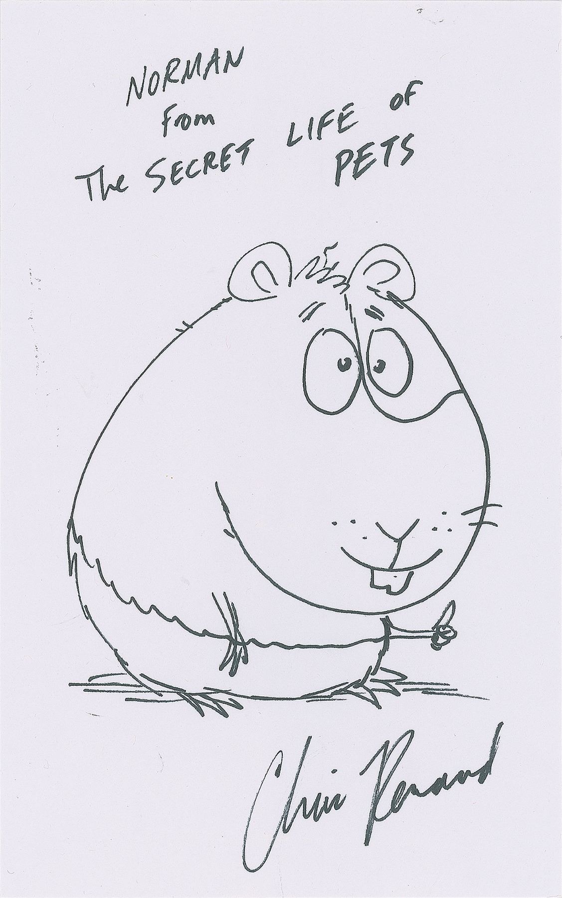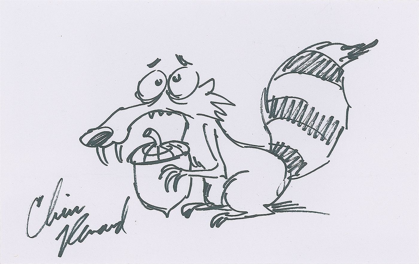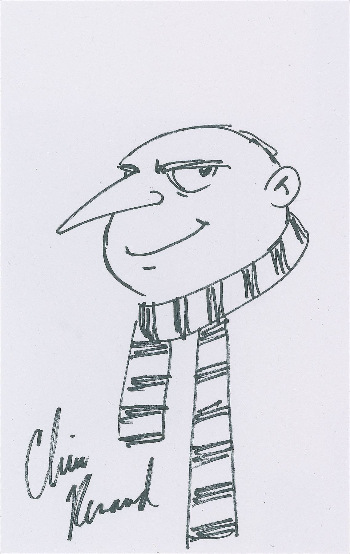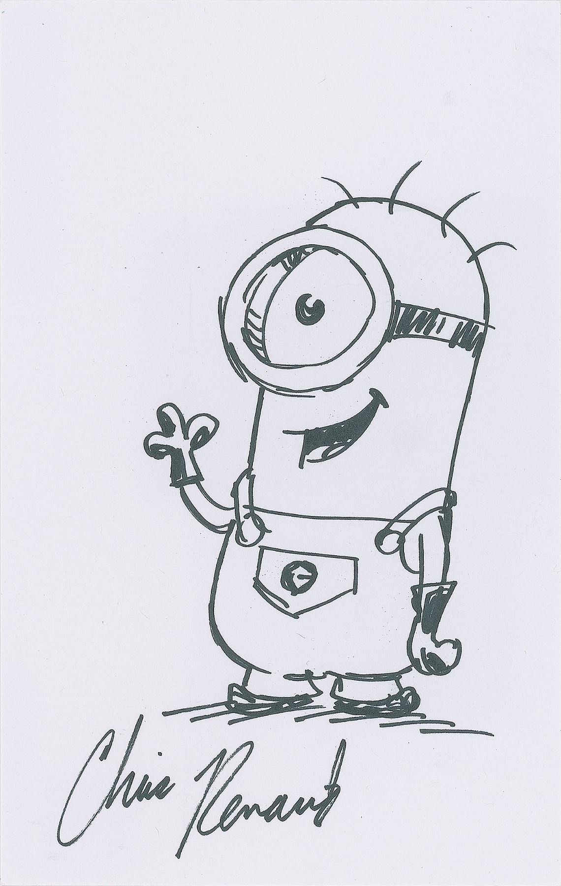 American illustrator and filmmaker (born 1966) who has worked on films like Despicable Me, Dr. Seuss' The Lorax, The Secret Life of Pets, and Ice Age. Fantastic set of four original felt tip sketches by Chris Renaud on individual white sheets, 5 x 8 and 8 x 5, each signed by Renaud. The sketches include: Gru the super villain from Despicable Me; a waving Minion from Despicable Me; the saber-toothed and acorn-obsessed squirrel Scrat from Ice Age; and Norman the guinea pig "from The Secret Life of Pets." In overall very fine condition.