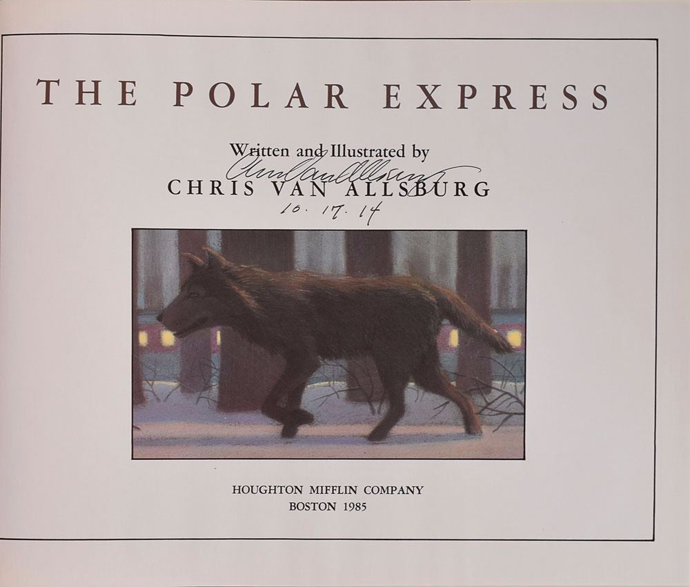 Signed book: The Polar Express. First edition. Boston: Houghton Mifflin Company, 1985. Hardcover with dust jacket, 11.5 x 9.25, 30 pages. Signed on the title page in black ink, "Chris Van Allsburg, 10.17.14." In fine condition, with small edge tears to the dust jacket.