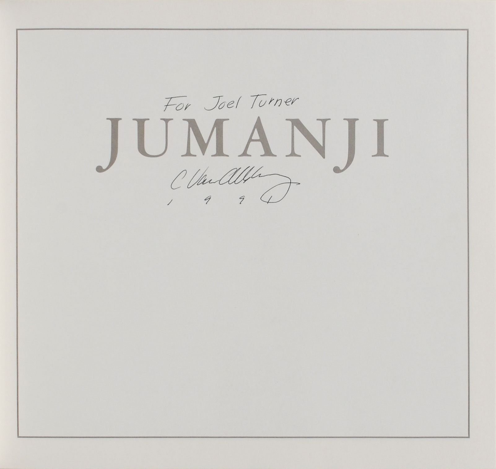 Signed book: Jumanji. First edition. Boston, MA: Houghton Mifflin Company, 1981. Hardcover with dust jacket, 11.25 x 10, 28 pages. Signed and inscribed on the half-title page in black ink, "For Joel Turner, C. Van Allsburg, 1991." In fine condition, with some light wear, and a small tear, to the dust jacket.