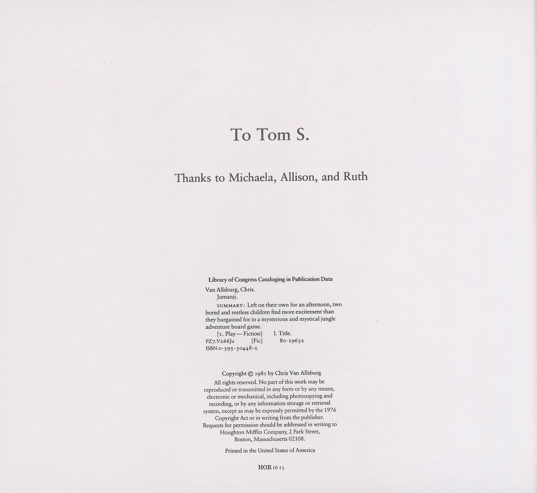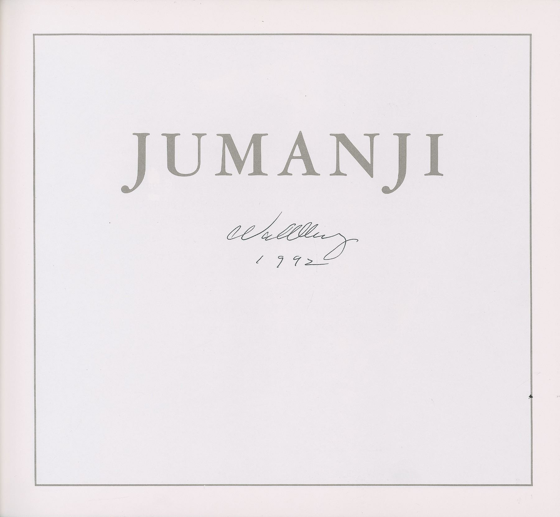 Signed book: Jumanji. Later printing. Boston: Houghton Mifflin, 1981. Hardcover with dust jacket, 11.25 x 10. Signed on the half-title page in black felt tip, "C. Van Allsburg, 1992." In fine condition.